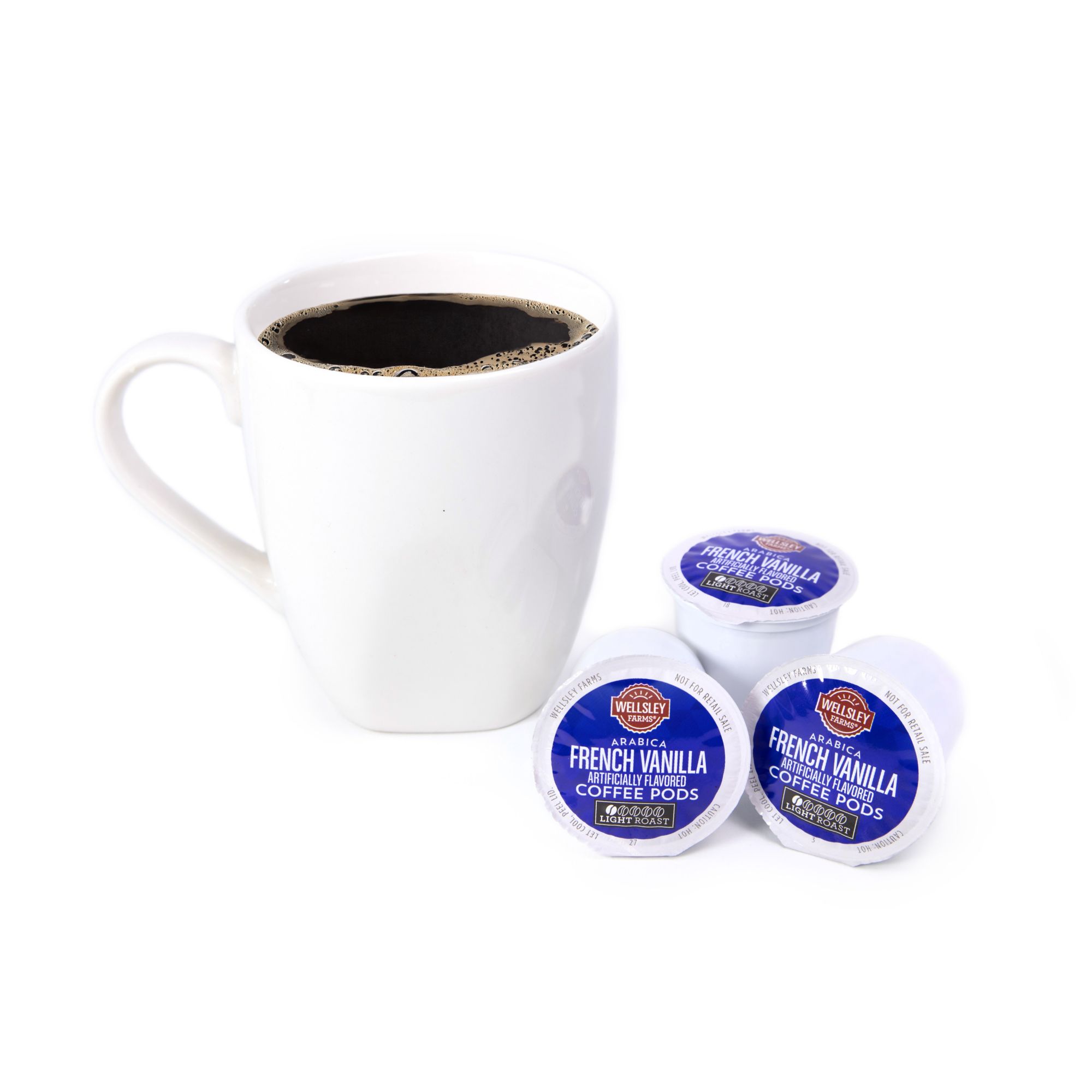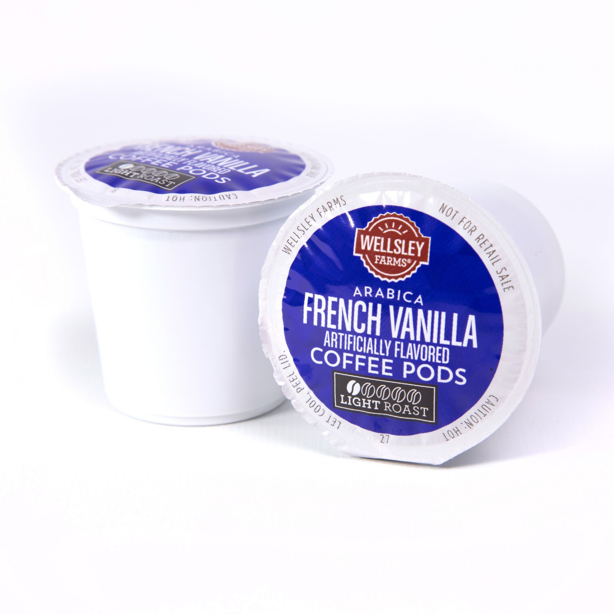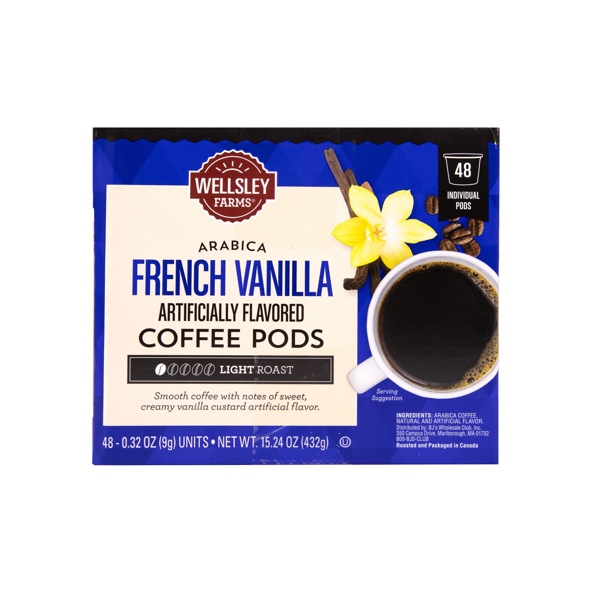 Includes a 48-count box of Wellsley Farms French Vanilla coffee pods