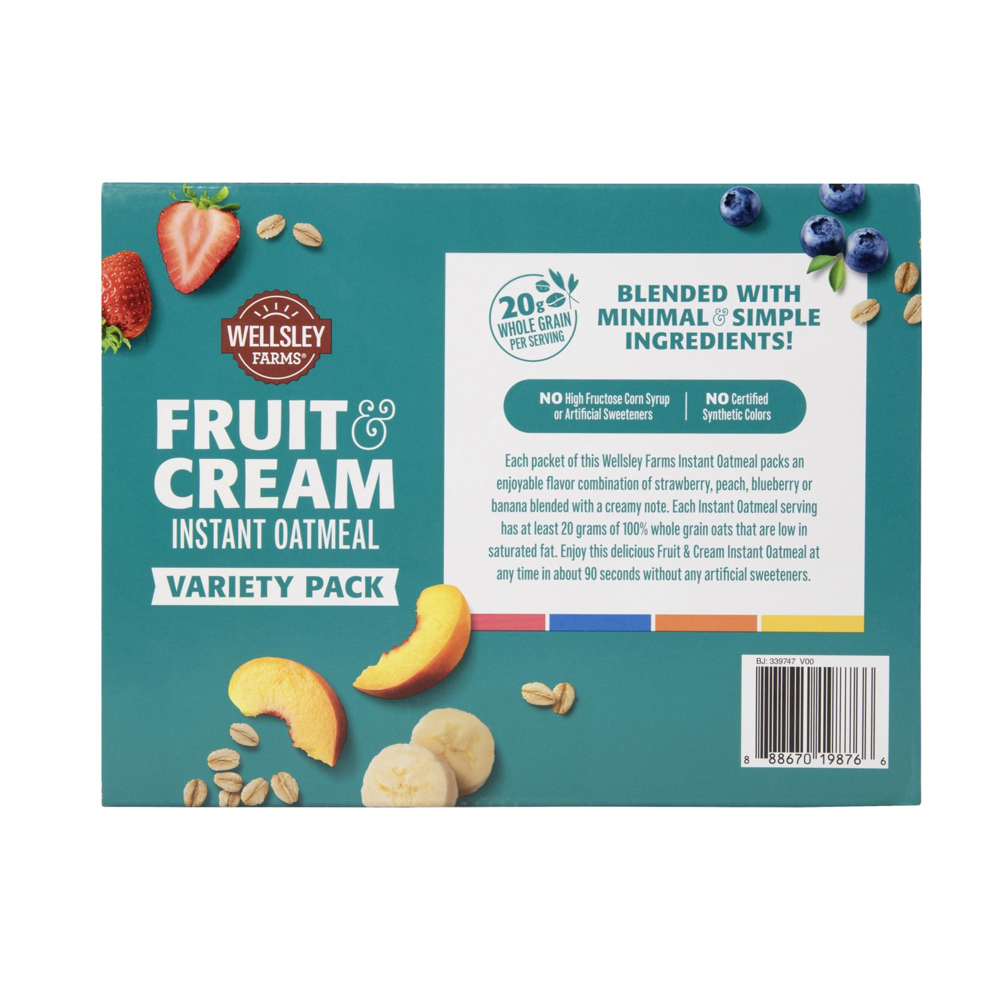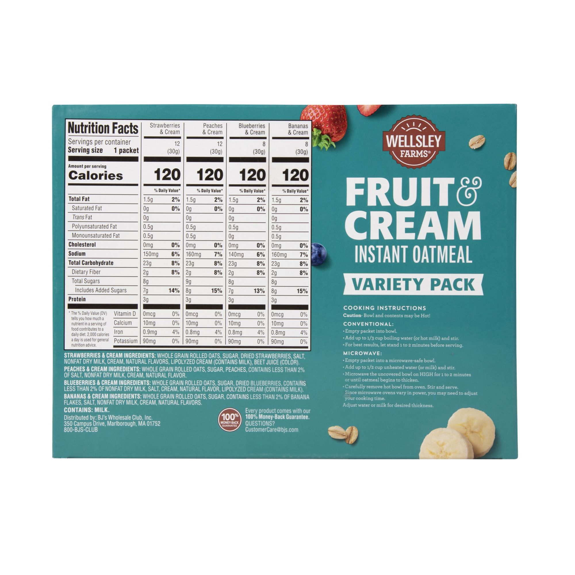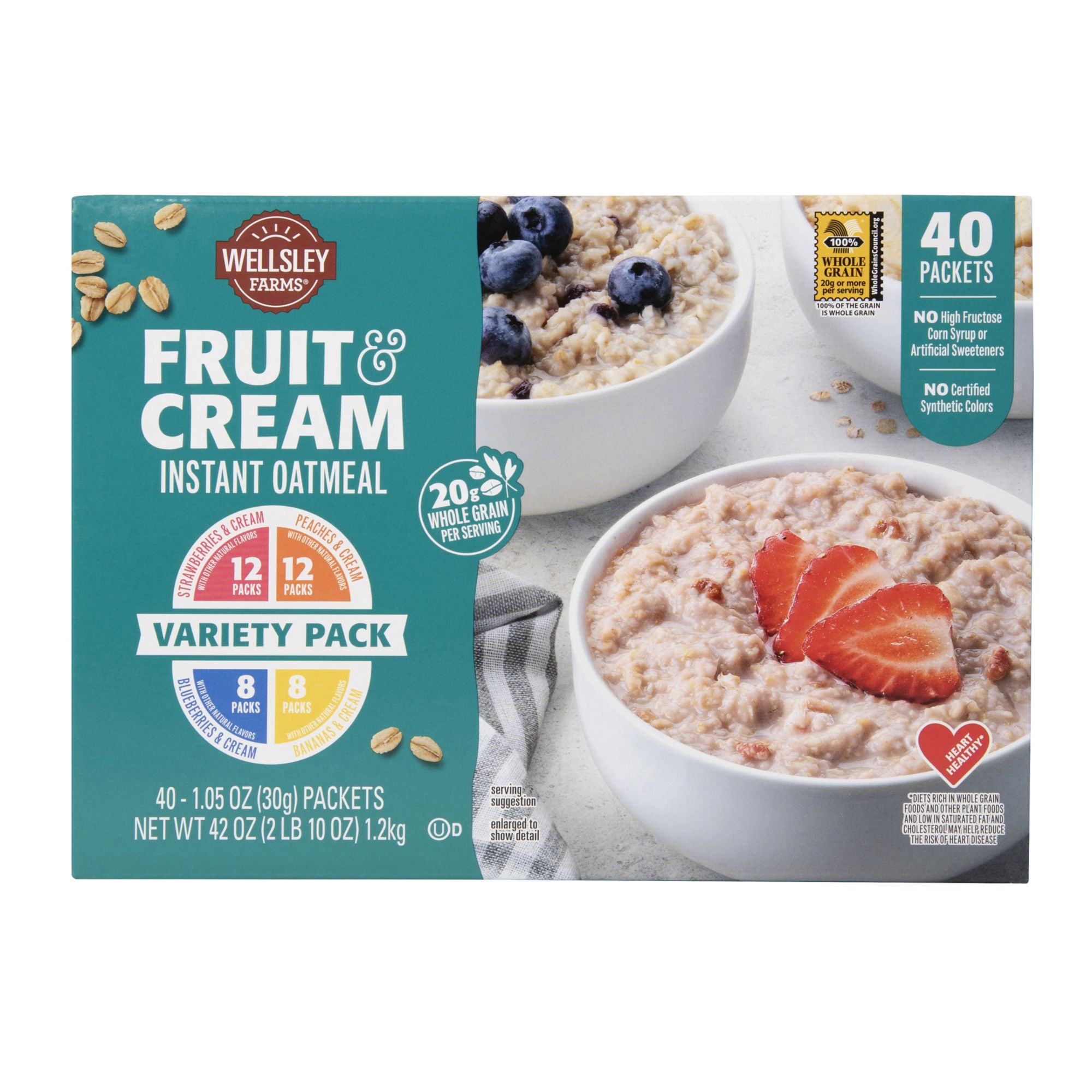 Wellsley Farms Fruit And Cream Instant Oatmeal Variety Pack contains naturally flavored instant oatmeal individual 1.05 oz. packets, with 40 packets per carton. Microwave prep (2-3 minutes).