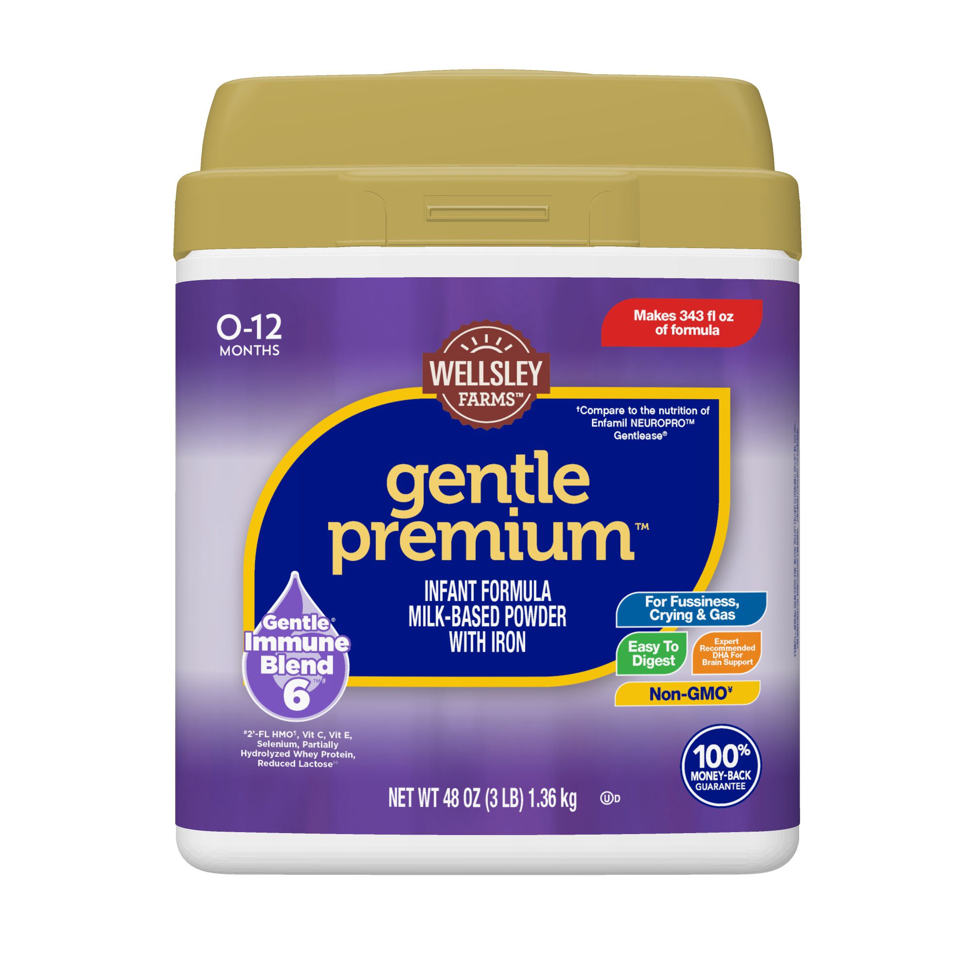 Wellsley Farms Gentle Premium Infant Formula is a milk based powder with iron. Compare to national brand Enfamil Neuropro Gentlease for fussiness, crying and gas. This easy to digest formula is expert recommended with DHA for brain support. This formula is designed for babies 0 - 12 Months, and contains 2'-FL HMO, vitamin C and E, selenium, and partially hydrolyzed whey protein.