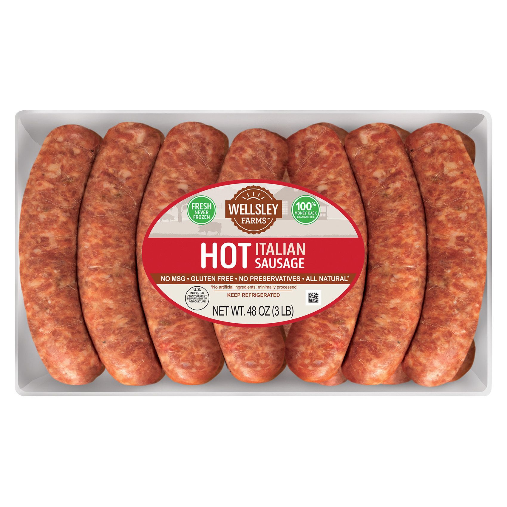 Wellsley Farms Hot Italian Sausage has no MSG, is gluten free, no preservatives, all natural. No artificial ingredients, minimally processed. Fresh, never frozen. 100% money back guarantee. Great on the grill, made with premium cuts of pork.