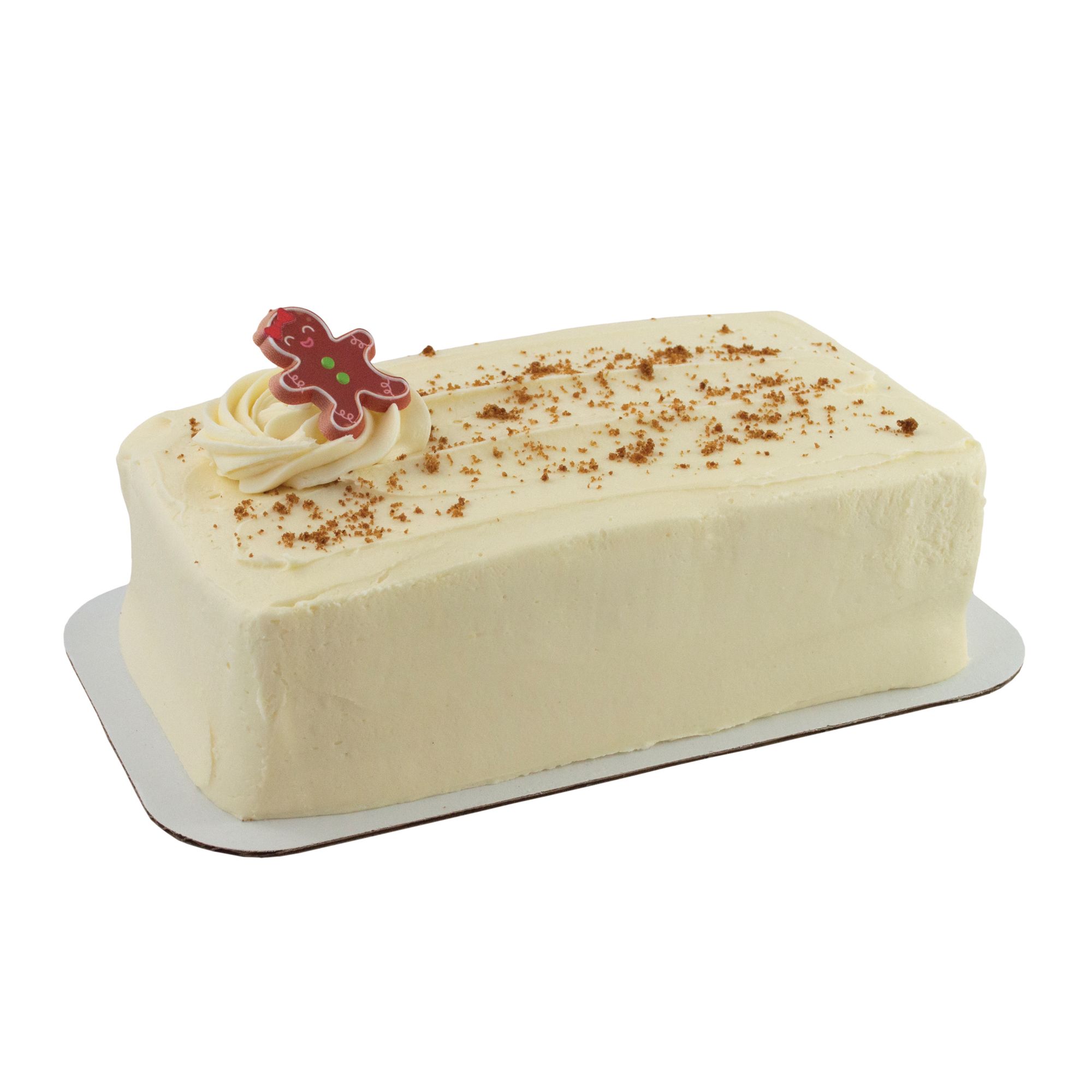 Wellsley Farms Gingerbread Bar Cake is a rich, moist gingerbread cake topped with a French Vanilla icing. The cake is decorated with a single rosette using French Vanilla icing, and garnished with a gingerbread cake crumb topping. Serves up to 10 people.