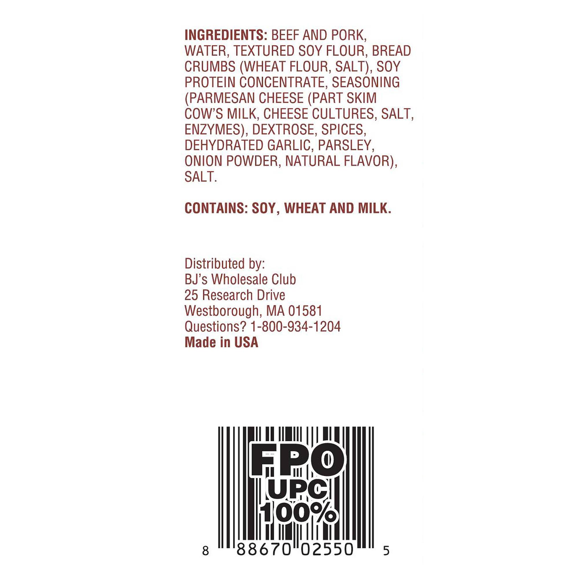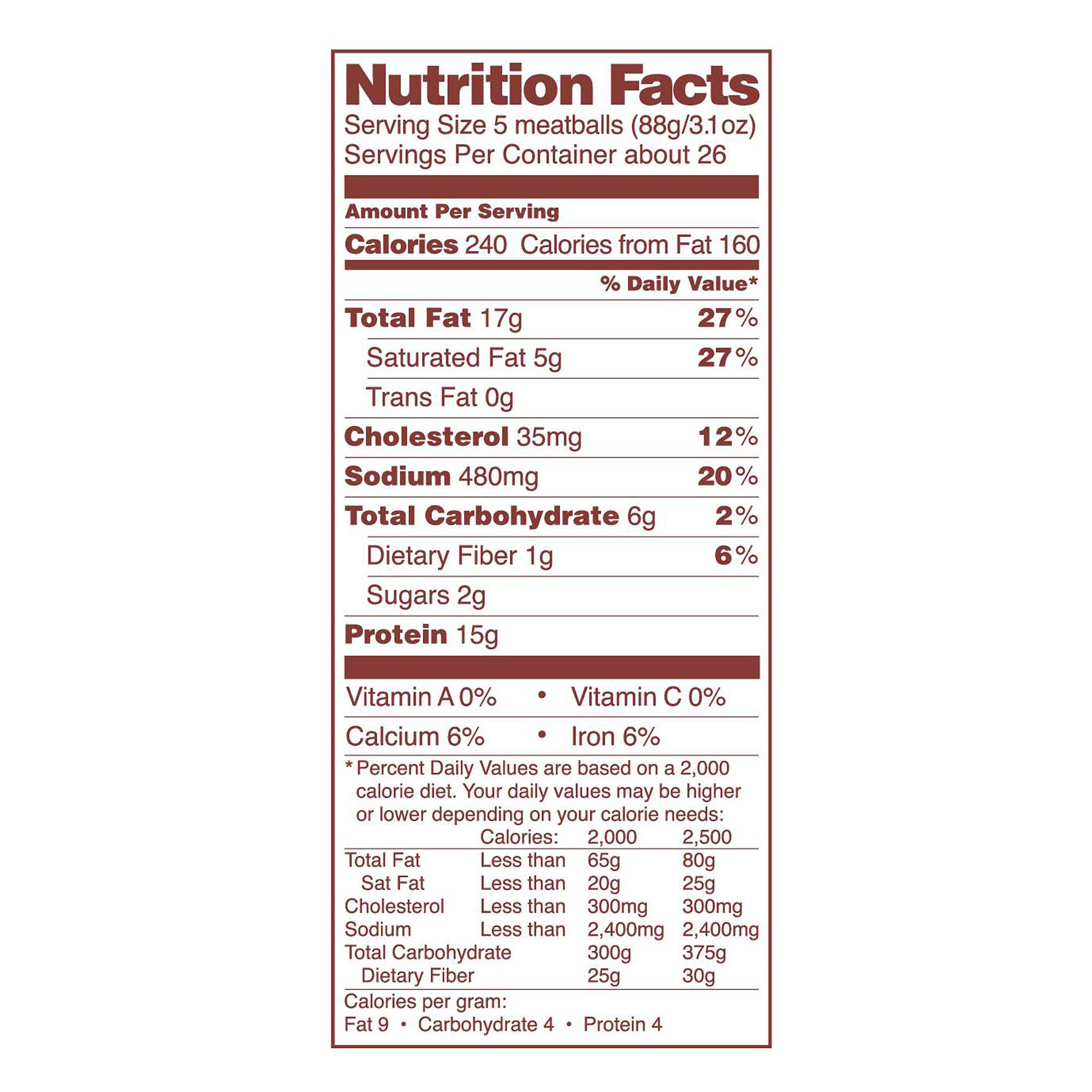 Fully-cooked Approximately 128 meatballs per package Cooks in 15-20 minutes Made in USA Includes 5 lbs. of frozen meatballs