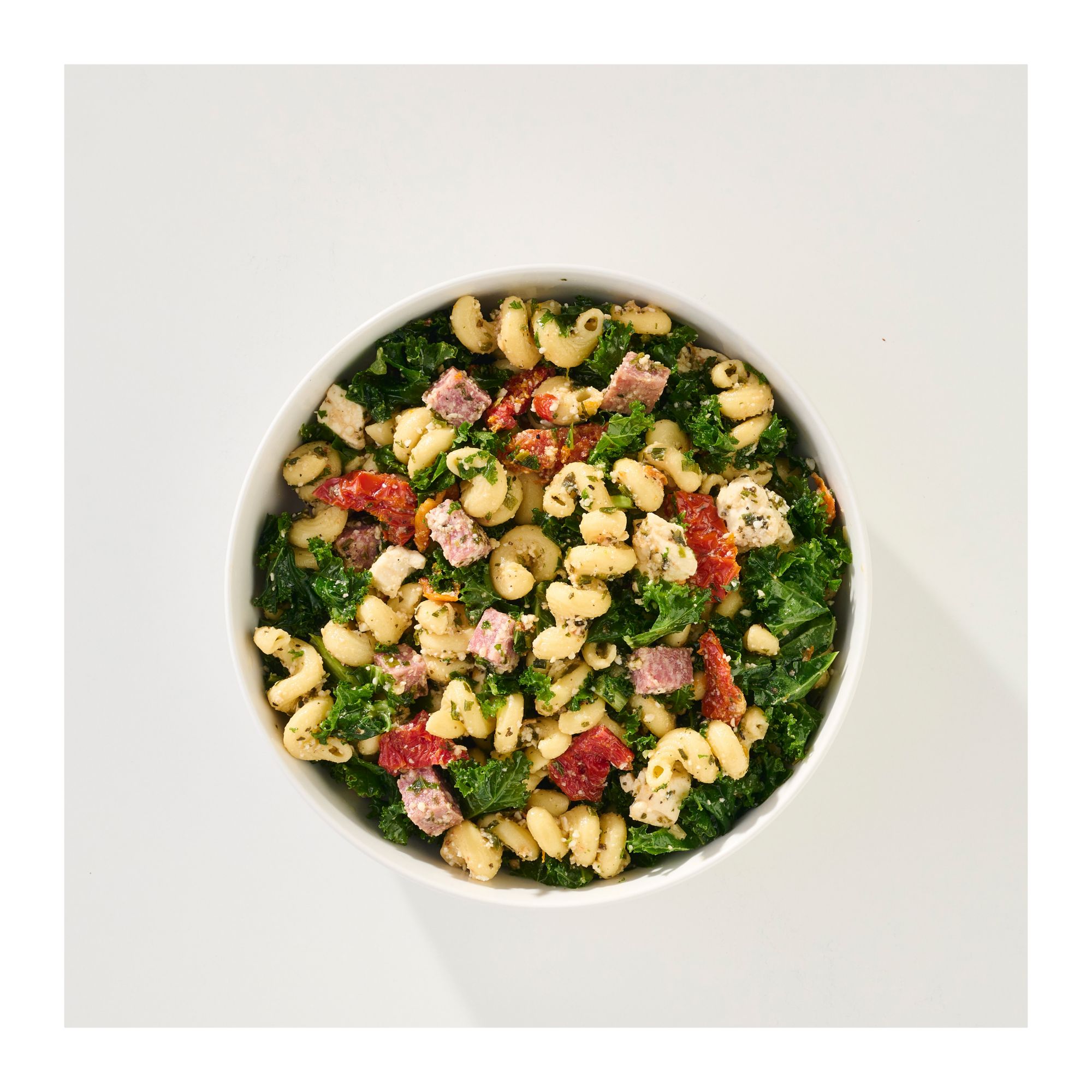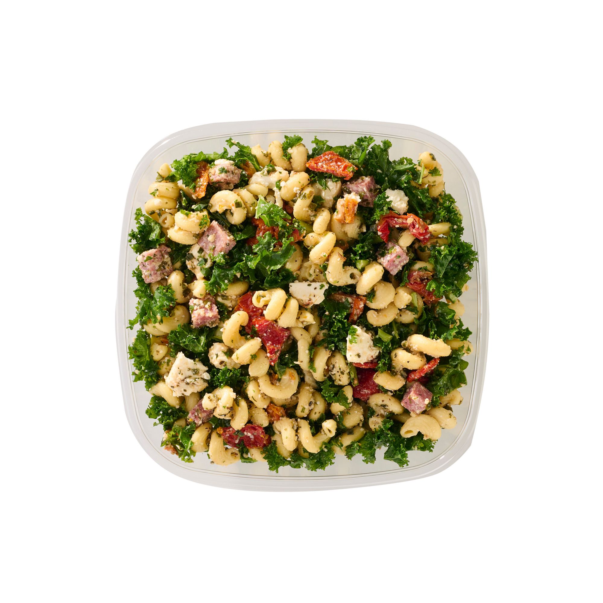 Ingredients: Cavatappi Pasta (Durum Wheat, Semolina, Niacin, Iron [Ferrous Sulfate], Thiamin Mononitrate, Riboflavin, Folic Acid), Canola Oil, Sundried Tomatoes (Sun Dried Tomatoes, Sodium Metabisulfite, Sodium Benzoate And Salt), White Balsamic Vinegar, Grated Parmesan Cheese (Parmesan Cheese [Pasteurized Part-skim Cow's Milk, Cheese Culture, Salt, Enzymes], Parmesan Style Cheese [Corn Starch, Water, Palm Oil, Cellulose, Salt, Natural Flavor, Caseinate, Sorbic Acid (As A Preservative), Annatto], Powdered Cellulose Added To Prevent Caking, Natamycin {A Natural Mold Inhibitor}), Salami (Pork, Salt, Contains Less Than 2% Of The Following: Dextrose, Natural Flavoring, Wine, Garlic, Lactic Acid Starter Culture, Sodium Ascorbate, Potassium Nitrate, Sodium Nitrite), Feta Cheese (Pasteurized Whole Milk, Skim Milk, Cream, Whey, Salt, Cultures, Enzymes, Potassium Sorbate, Guar Gum, Xanthan Gum), Salt, Preservatives (Water, Sodium Benzoate, Potassium Sorbate), Spices.