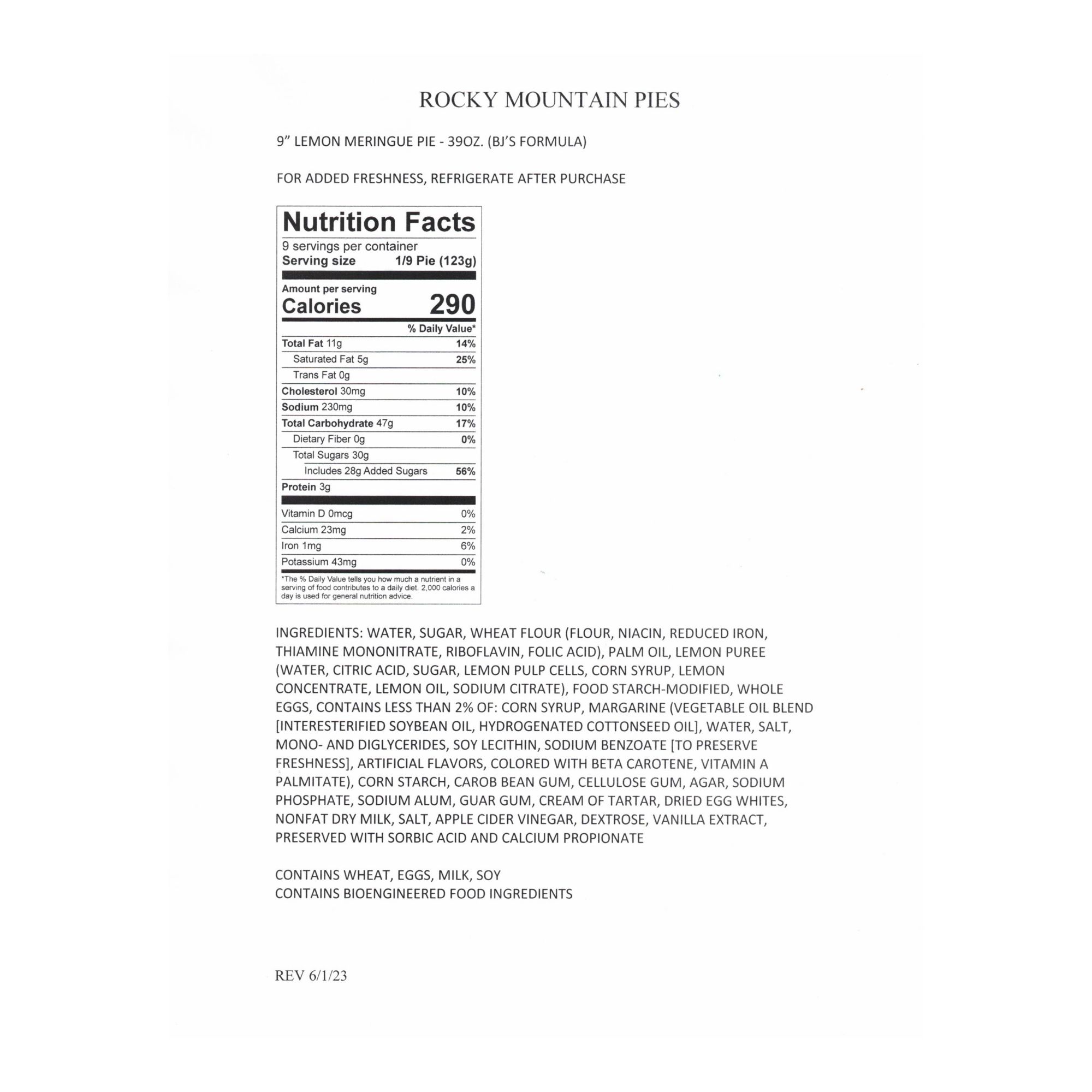 Wellsley Farms Lemon Meringue Pie is made with a tender flaky pastry crust, and filled with double strength lemon puree. A light, fluffy meringue is hand peaked to give it that homemade look. This pie serves up to 9 and is great for any event.