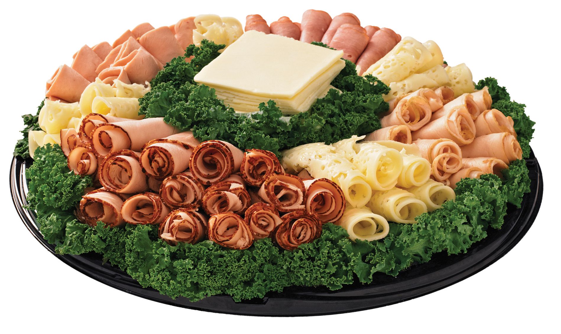 Perfect for parties with 20 to 25 guests Wellsley Farms oven-roasted, reduced-sodium turkey, smoked turkey breast, cooked ham and oven-roasted chicken Lacey Swiss cheese and Land O'Lakes 2% American cheese Includes one platter