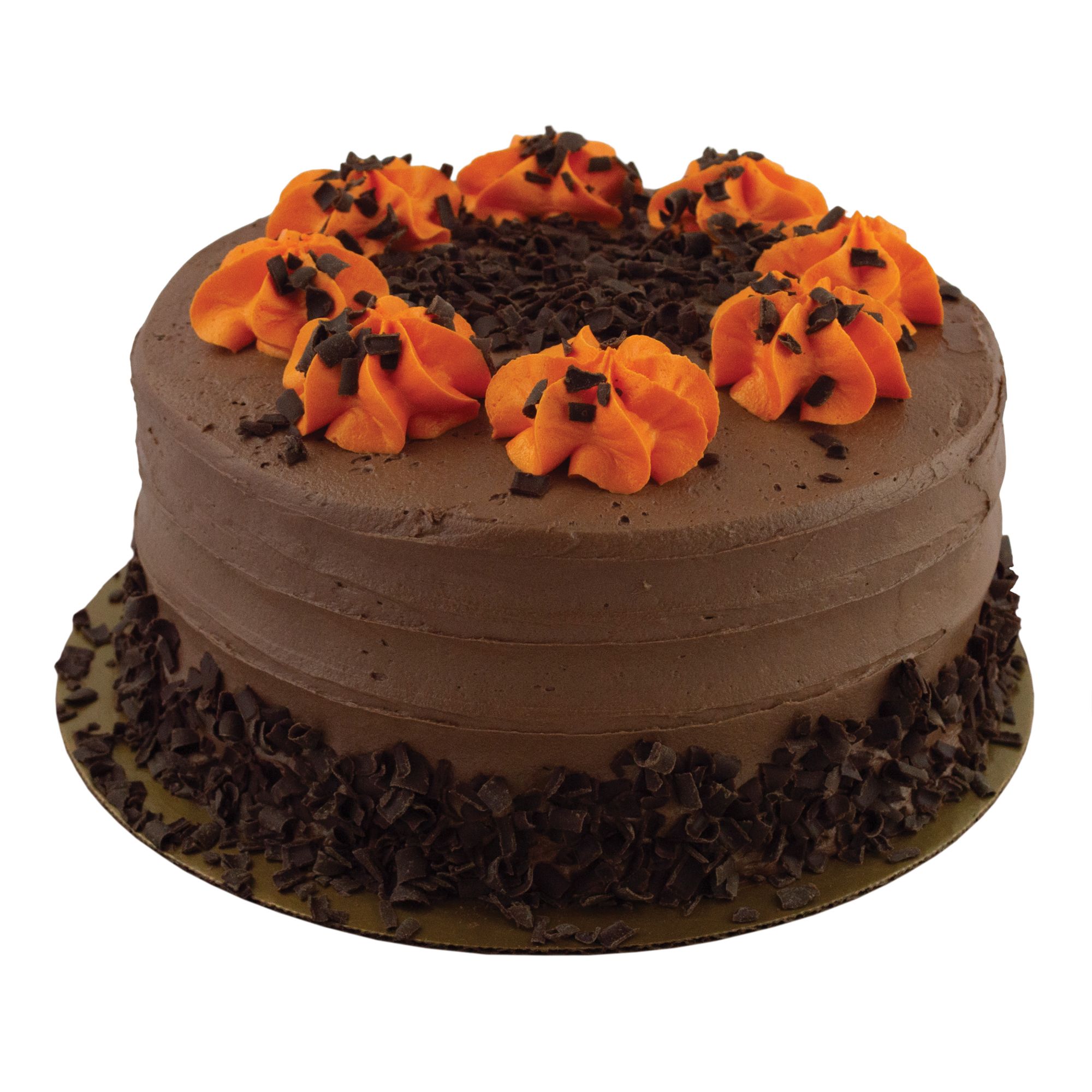 Wellsley Farms Marbled Chocolate & Orange Color Blast Cake is a moist double-layer cake that is perfect for Halloween parties. This cake has chocolate and orange-colored cake layers filled and iced with a creamy chocolate icing. The top of the cake is decorated with eight orange rosettes, and garnished with dark chocolate crushed curls along the base and on top of the cake.