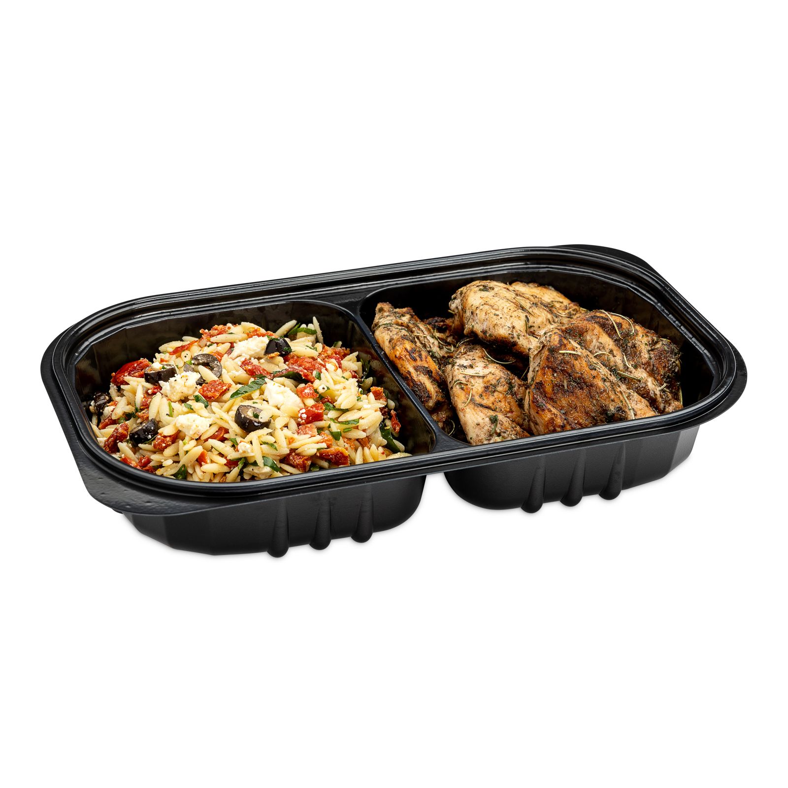 Fully cooked Herb Seasoned Grilled Chicken Breast Cutlets with a side of Orzo Salad. A perfect meal solution for a family, or a healthy meal for on the go. Great for a center plate or as a salad topper.