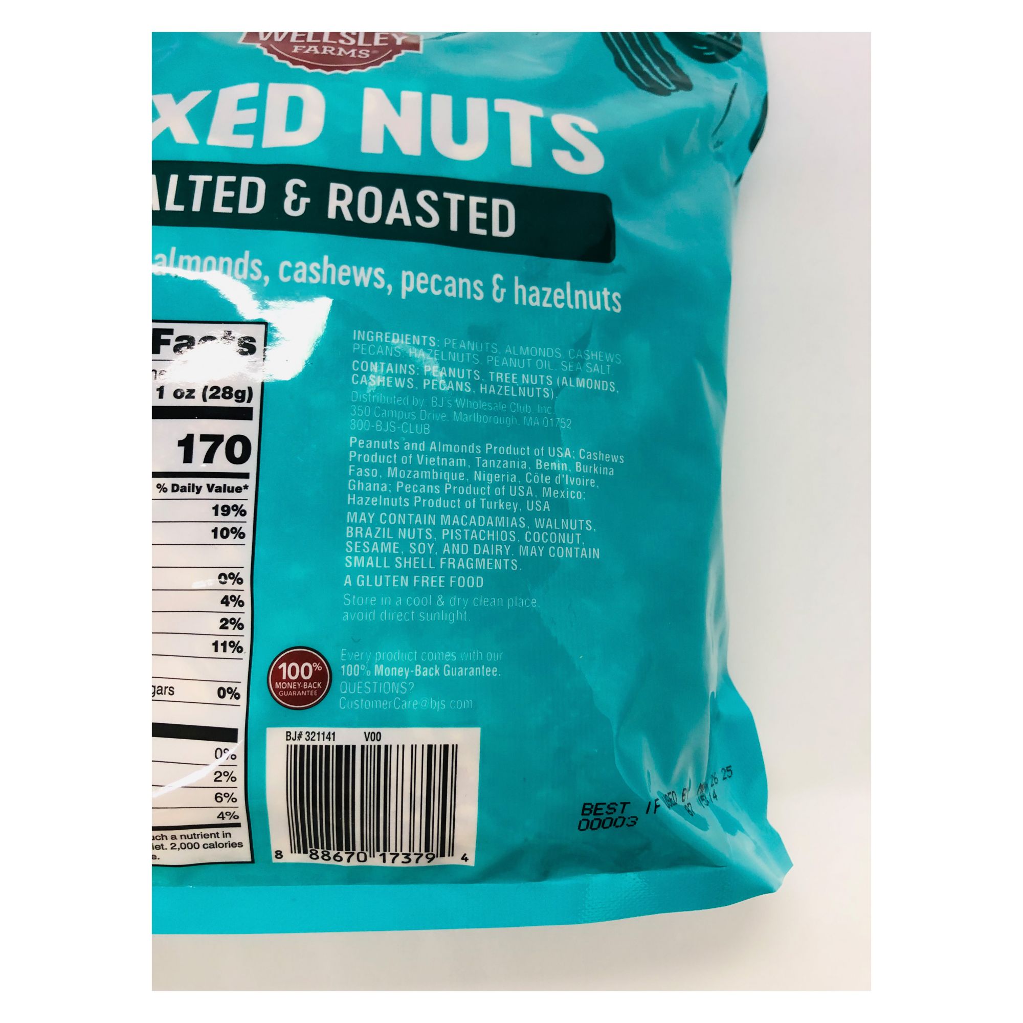Wellsley Farms Mixed Nuts With Peanuts is a roasted blend of peanuts, almonds, cashews, hazelnuts, and pecans. This mix is gluten-free, Kosher, and non-GMO. This mix contains peanuts and tree nuts. Processed on equipment that also processes: Almonds, Brazil Nuts, Hazelnuts, Cashews, Coconuts, Macadamia Nuts, Pecans, Pistachios, Walnuts, Peanuts, Dairy, Soy and Sesame.