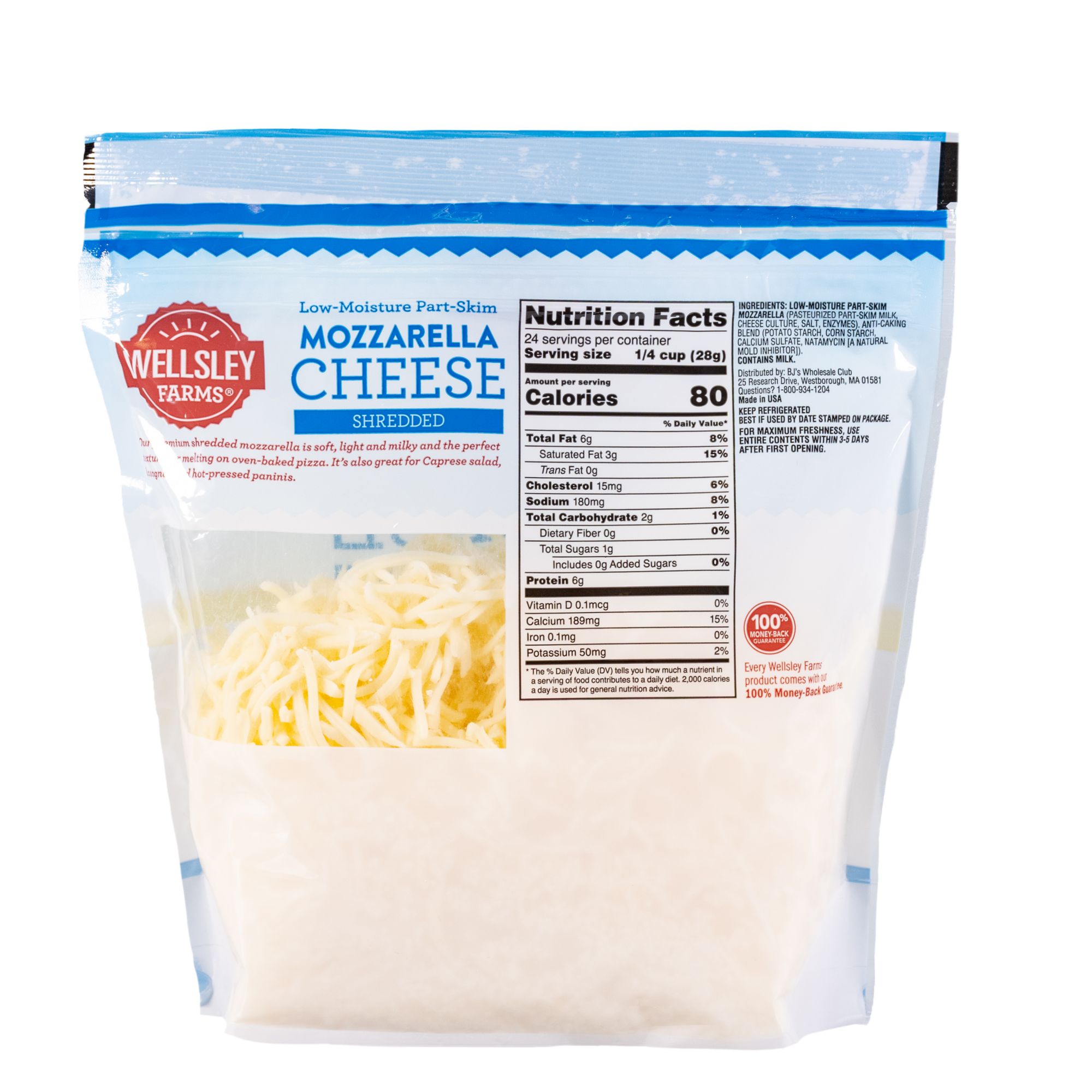 With a low-moisture, part-skim recipe, this Wellsley Farms 24 Oz. Shredded Mozzarella Cheese is an ideal addition to pizzas, lasagnas or hot-press panini sandwiches. The bags are resealable to maintain freshness. This pack includes two bags of 24 oz. Wellsley Farms shredded mozzarella cheese.