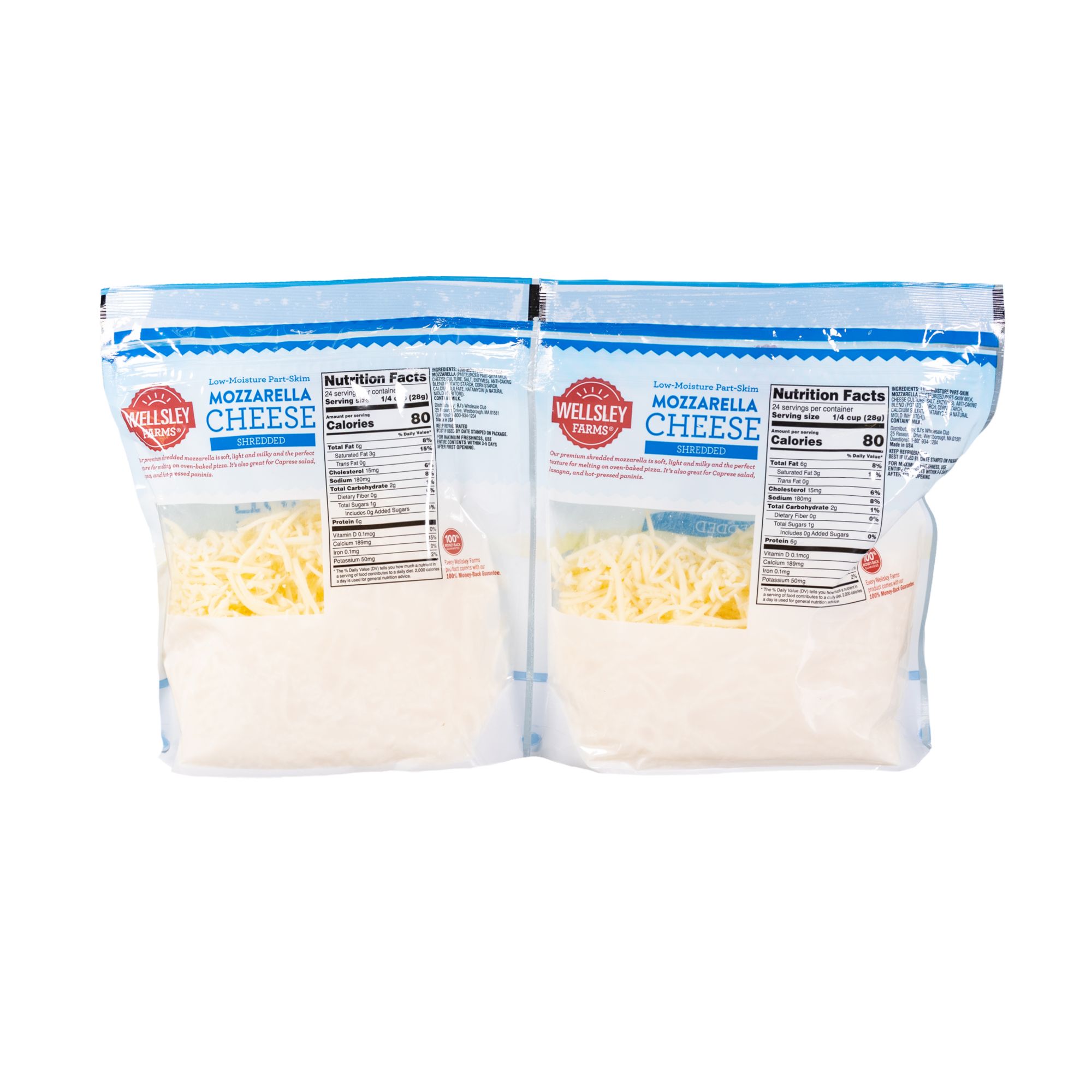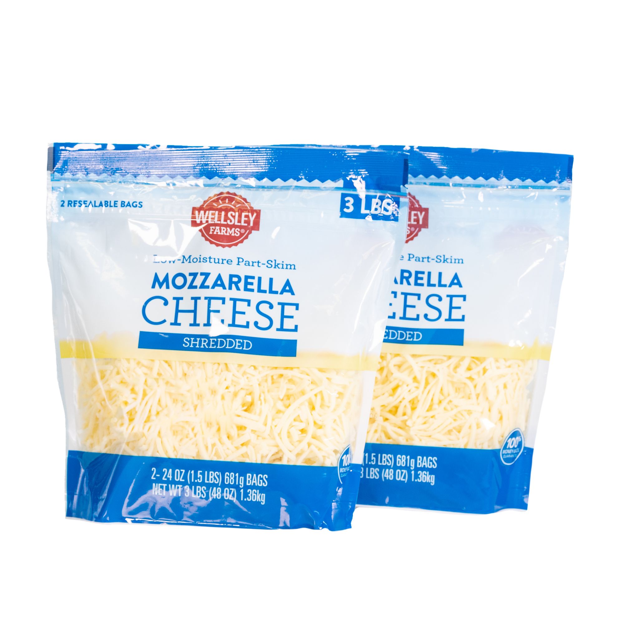 With a low-moisture, part-skim recipe, this Wellsley Farms 24 Oz. Shredded Mozzarella Cheese is an ideal addition to pizzas, lasagnas or hot-press panini sandwiches. The bags are resealable to maintain freshness. This pack includes two bags of 24 oz. Wellsley Farms shredded mozzarella cheese.