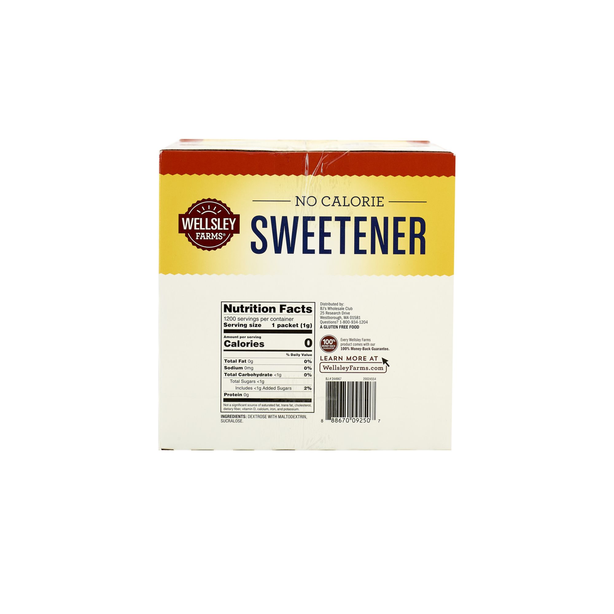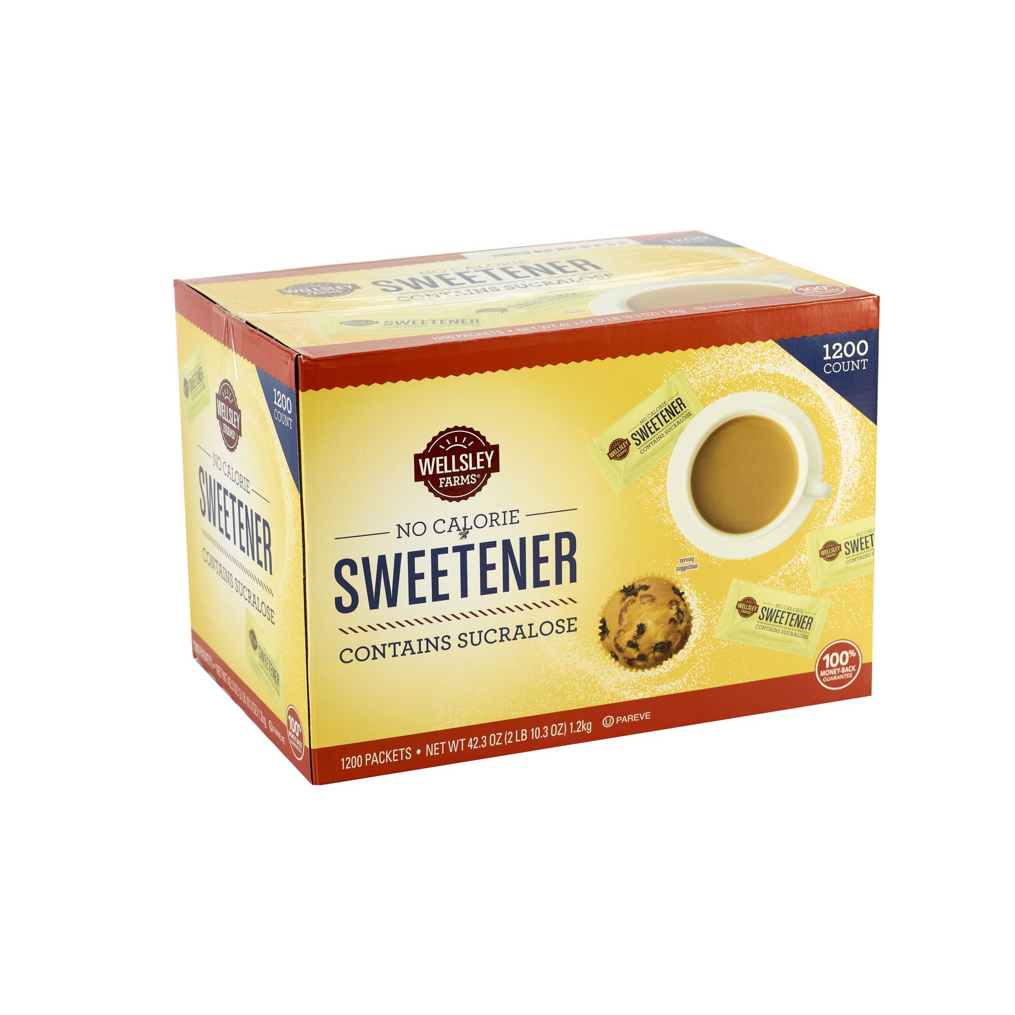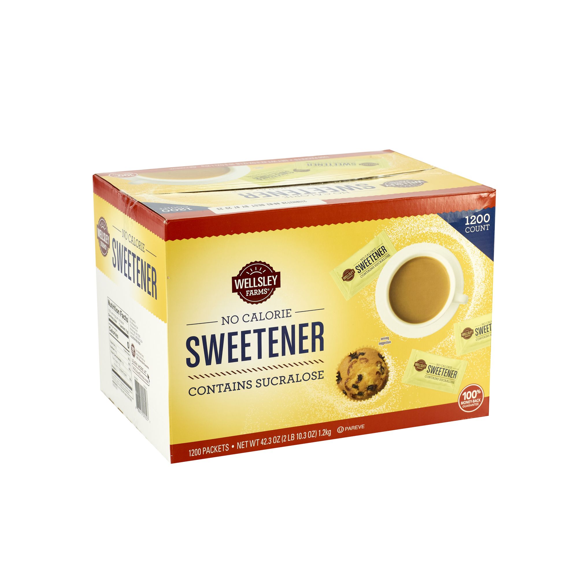 Wellsley Farms zero-calorie sucralose sweetener is great-tasting and is a great replacement for regular sugar. Great for an office space or kitchen. This pack incudes 1200 sweetener packs.