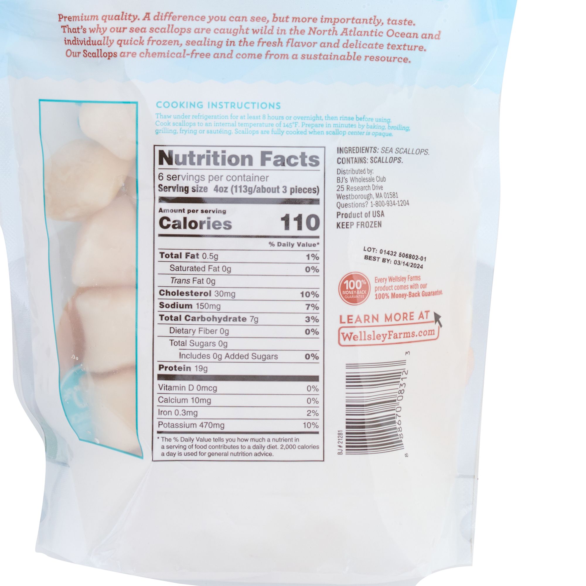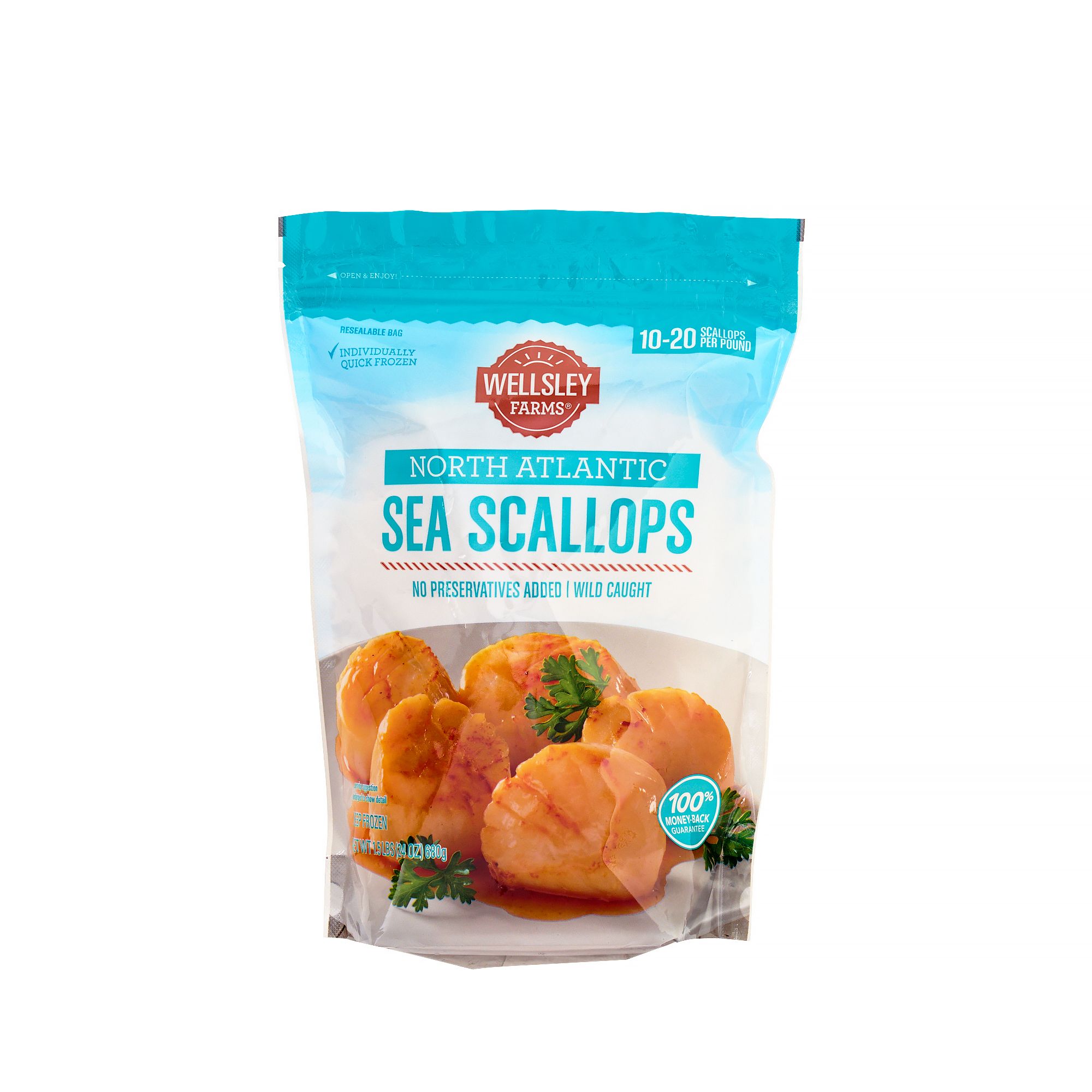Wellsley Farms premium-quality scallops offer a difference you can see, but more importantly, taste. That's why these sea scallops are caught wild in the North Atlantic oceans and Individually Quick Frozen (IQF), sealing in the fresh flavor and delicate texture. Wellsley Farms sea scallops are all-natural, chemical-free and come from a sustainable resource.