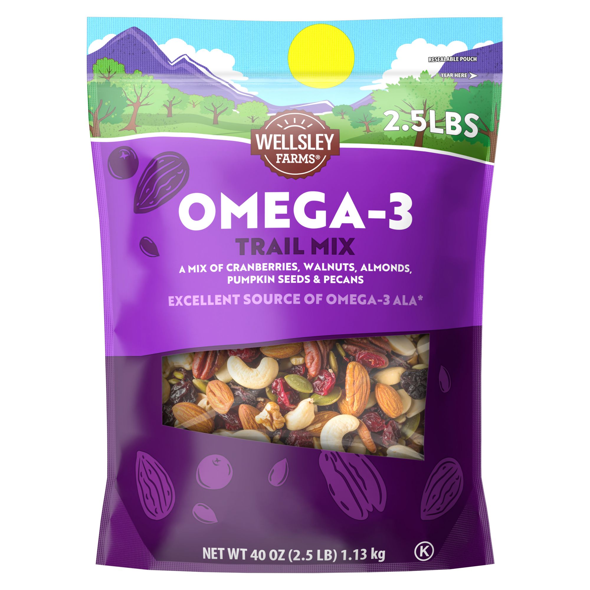 Discover the Wellsley Farms Omega-3 Trail Mix, a healthy trail mix crafted for flavor and nutrition. This powerhouse blend features sweetened dried cranberries, premium walnuts, roasted almonds, pumpkin seeds, and pecan halves, delivering a naturally satisfying crunch in every bite. Packed with heart-healthy Omega-3 ALA, this non-GMO snack mix offers plant-based protein and a balanced sweet-and-salty taste. Each convenient pack is perfect for on-the-go snacking, with no artificial flavors, colors, or preservatives, just wholesome ingredients for a better snack choice. Enjoy a premium nut blend that’s ideal for energy, sharing, and smart snacking.
