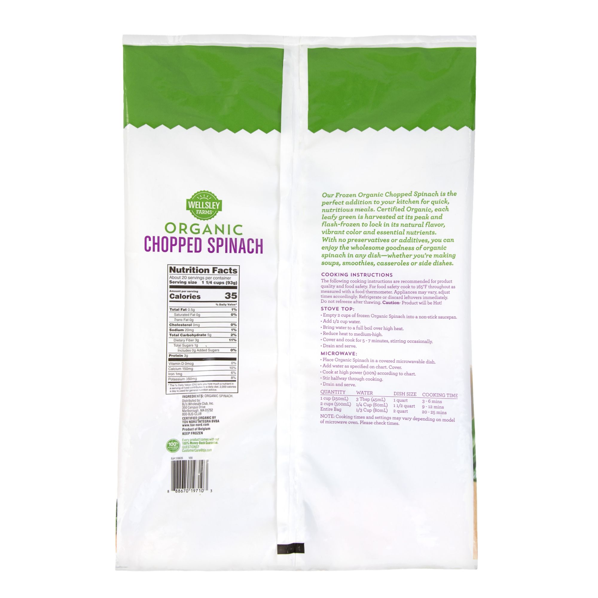 Bring a burst of flavor and nutrition to any meal with Wellsley Farms Frozen Organic Chopped Spinach. Individually quick frozen, Grade A and certified organic, this frozen chopped spinach is perfect for soups, stews, smoothies, pasta dishes or just as a side for a meal. Pre-chopped for a convenient and hassle-free cooking experience.