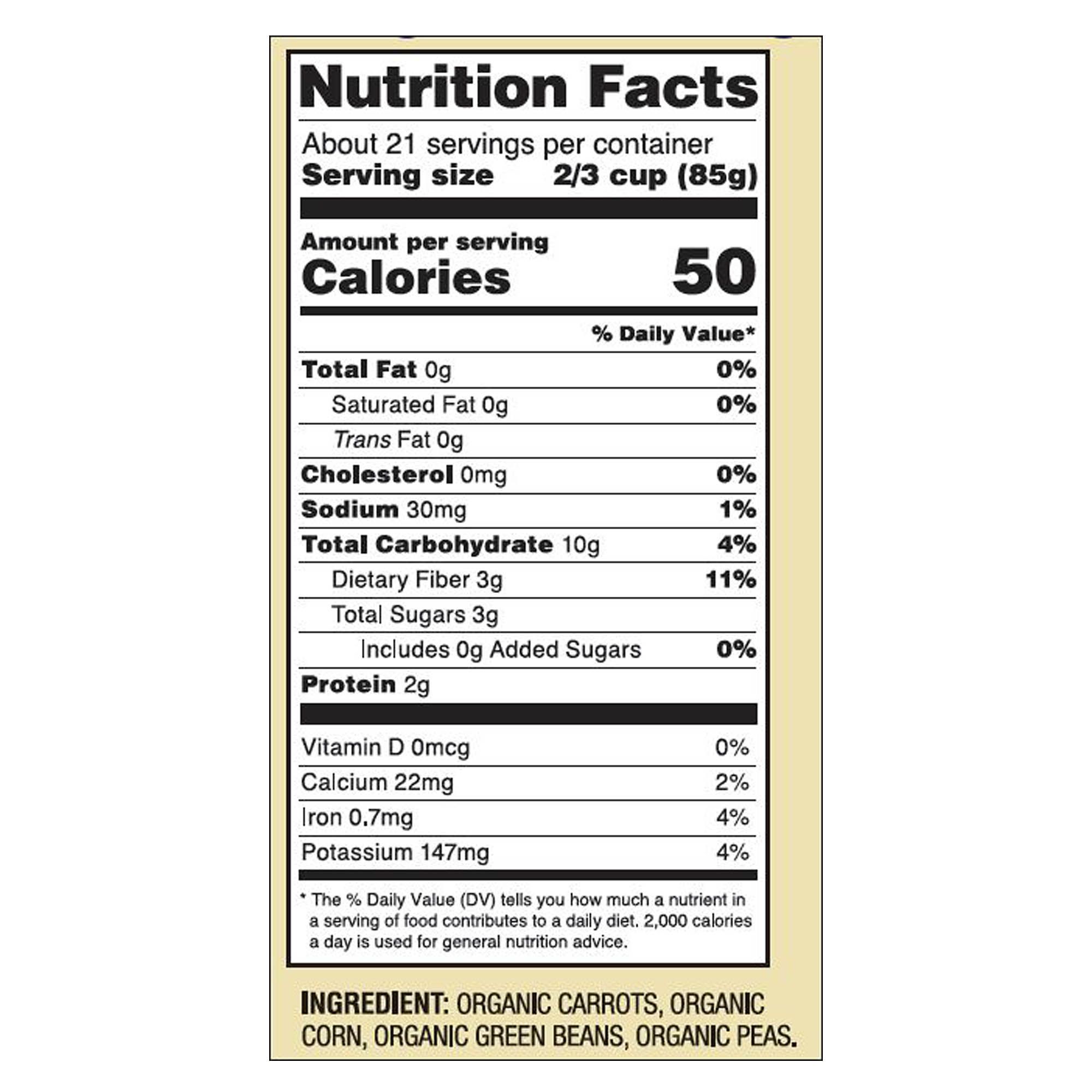 Features corn, green beans, peas and carrots USDA organic certified Includes four lbs. of organic mixed vegetables