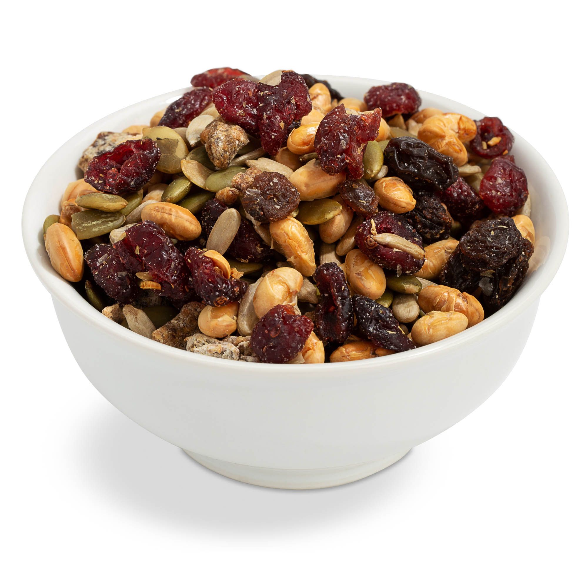 Organic trail mix Contains pepitas, soy nuts, sunflower seeds and dried cranberries, cherries and dates Includes 17 oz. of trail mix
