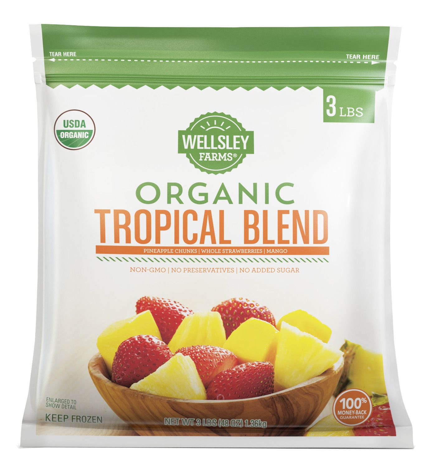 Wellsley Farms organic tropical fruit blend is great with breakfast, in smoothies or for everyday snacking. The tropical blend pack includes whole strawberries, mangos and pineapple chunks. All of these fruits are grown organically, certified kosher and high in vitamin C.