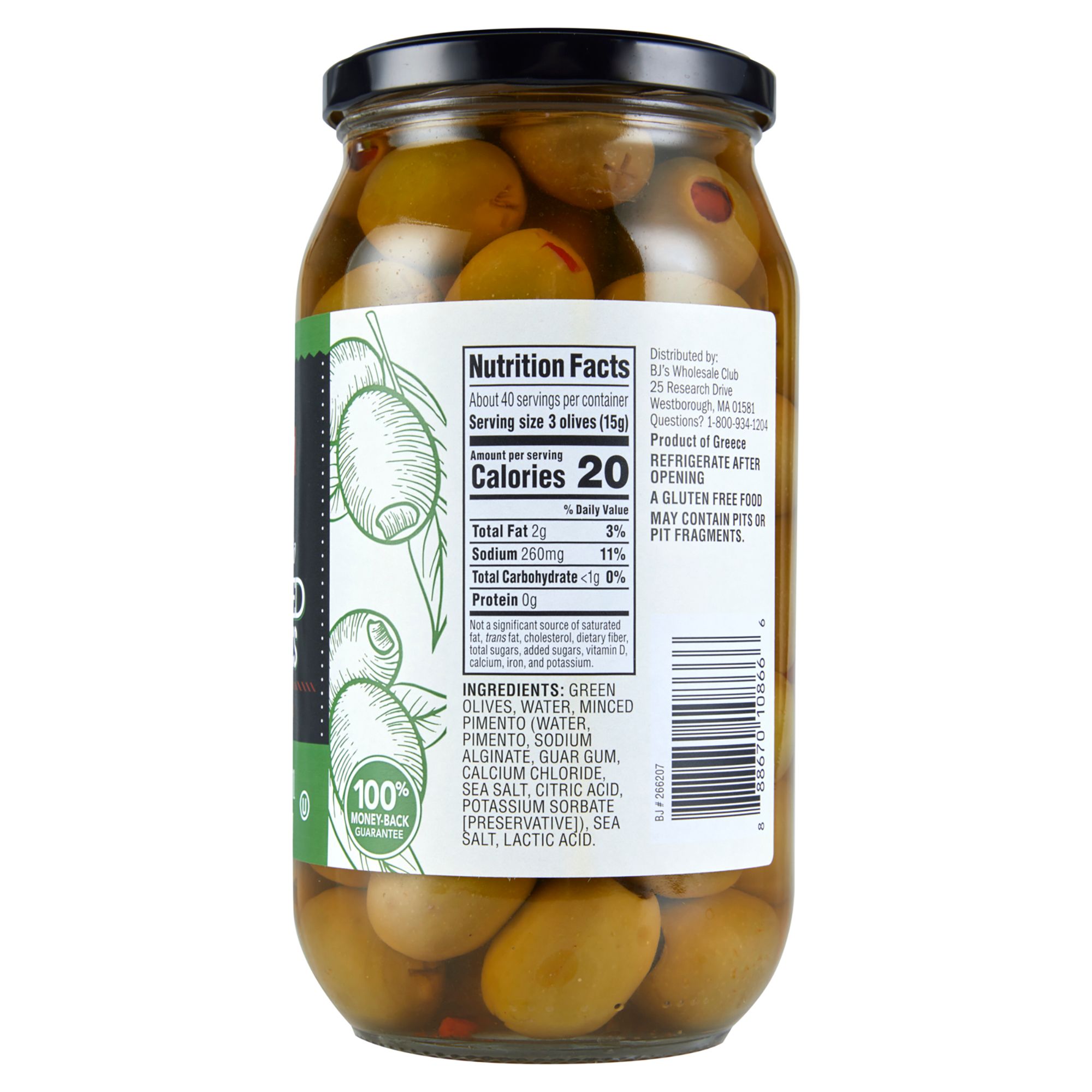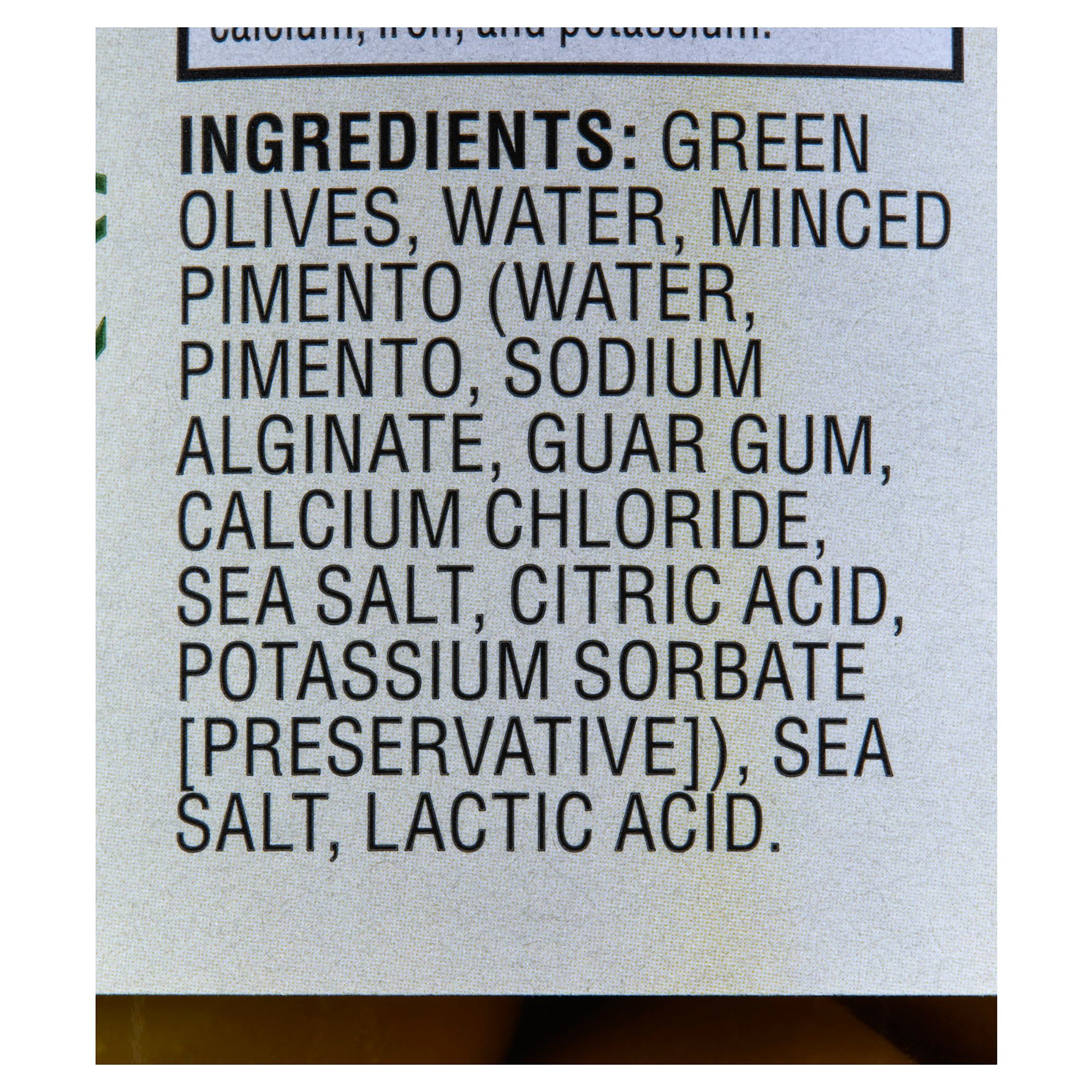 Ingredients: Green Olives, Water, Minced Pimento (Water, Pimento, Sodium Alginate, Guar Gum, Citric Acid, Potassium Sorbate (Preservative)), Sea Salt, Lactic Acid.