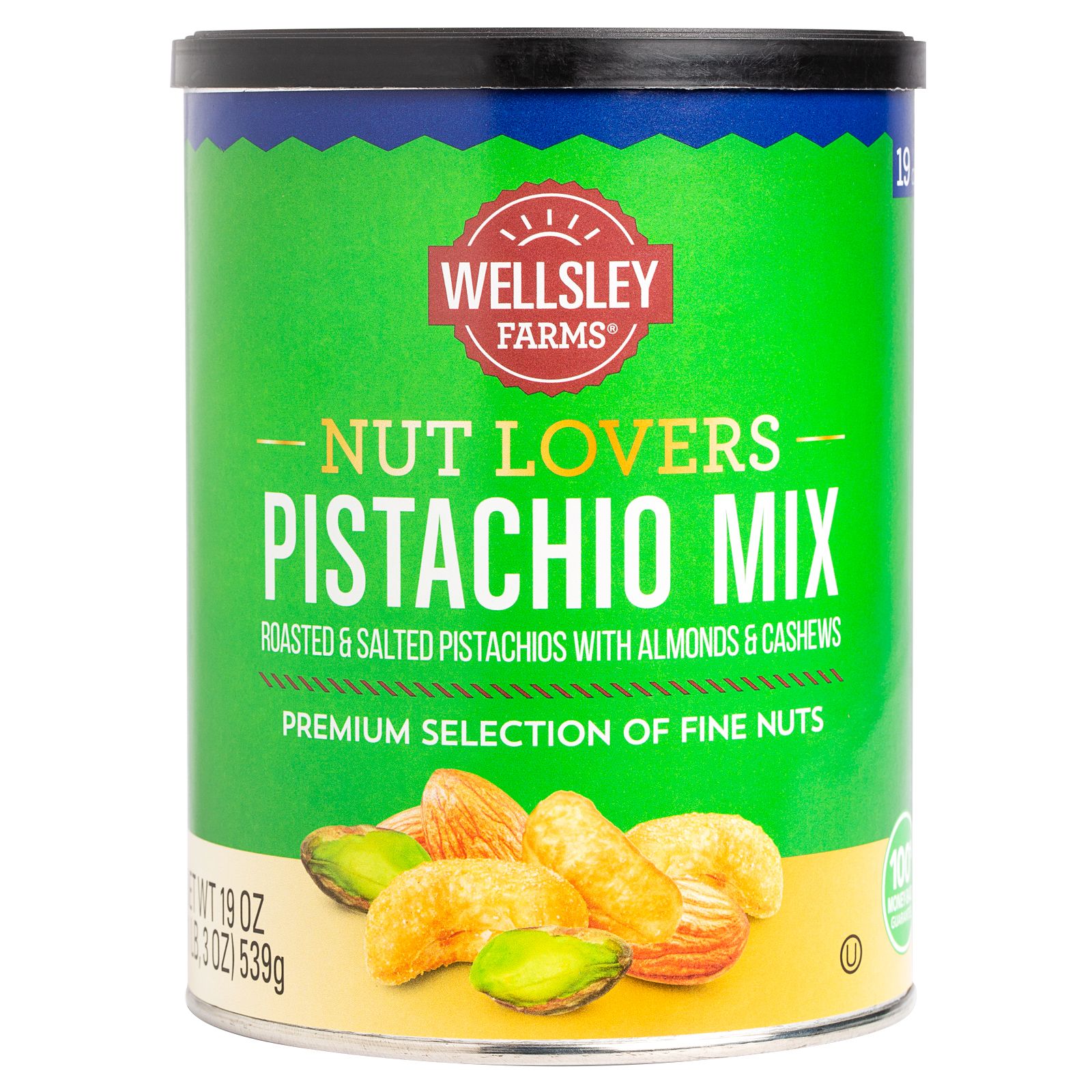 The Wellsley Farms Pistachio Lovers Mix is made with high-quality nuts and is lightly roasted and salted with sea salt. This resealable canister contains a perfect mixture of almonds, cashews, and extra pistachios to give you a slightly salty snack that will satisfy your taste buds with every handful.