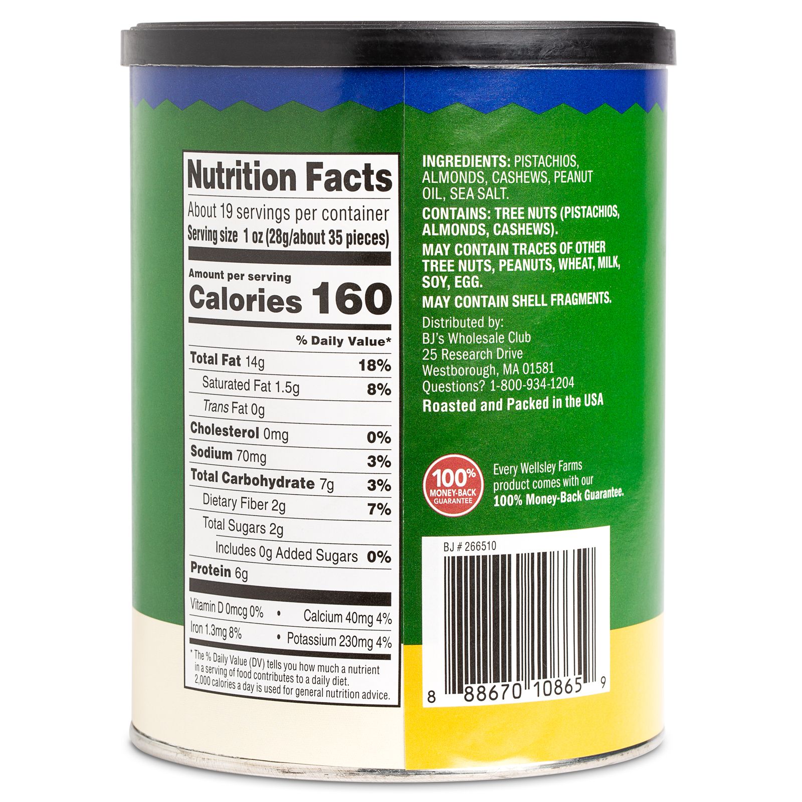 This product has been especially formulated for BJ's and is being produced under the Wellsley Farms brand High-quality nuts Pistachio, almonds, and cashews Lightly roasted to preserve taste and crunch of nuts Fresh and crunchy snack Serving Size: 1 oz. (28g/about 35 pieces) Shelf Life: 18 months Includes 19 oz. pistachio lovers mix