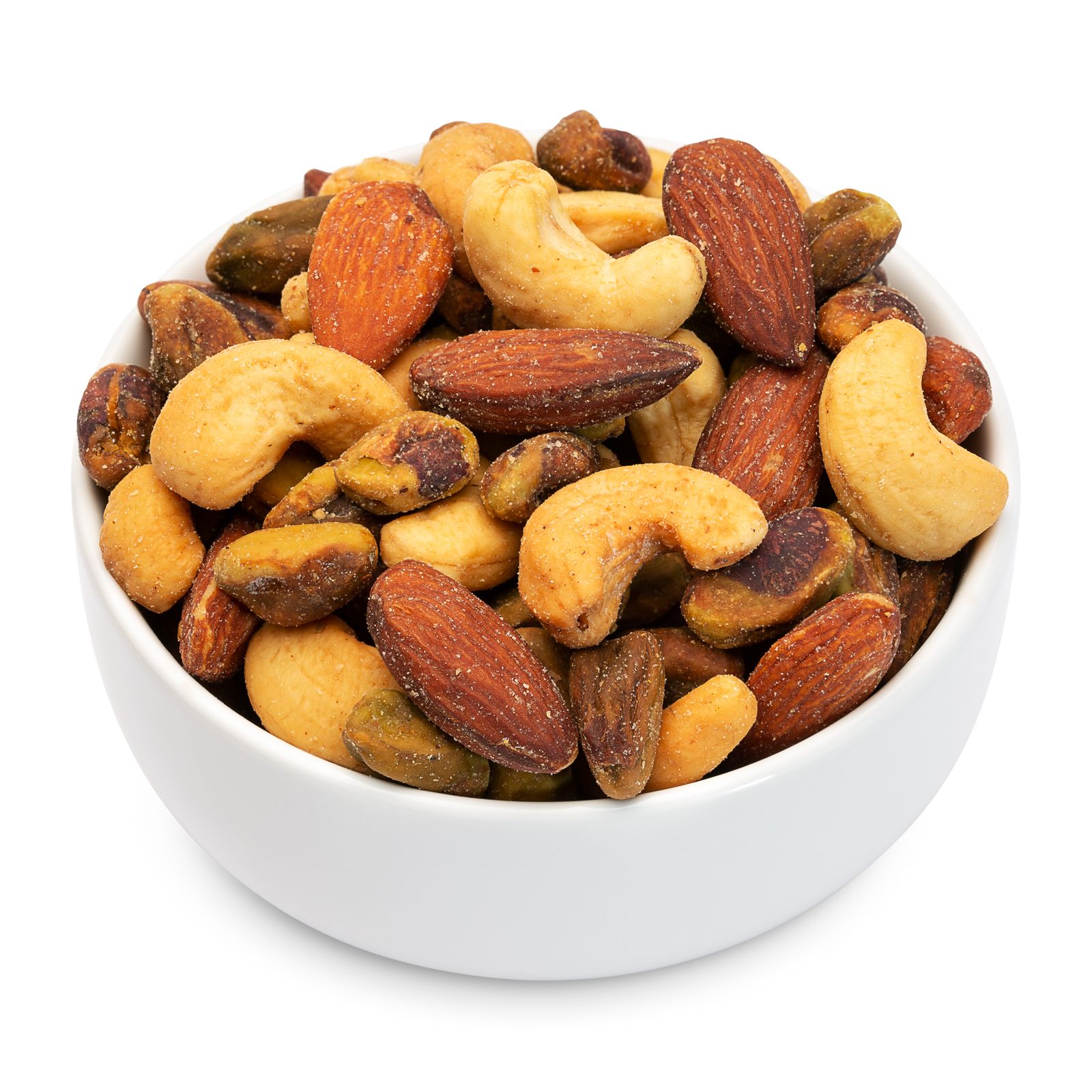 Pistachios, almonds, cashews, peanut oil, and sea salt