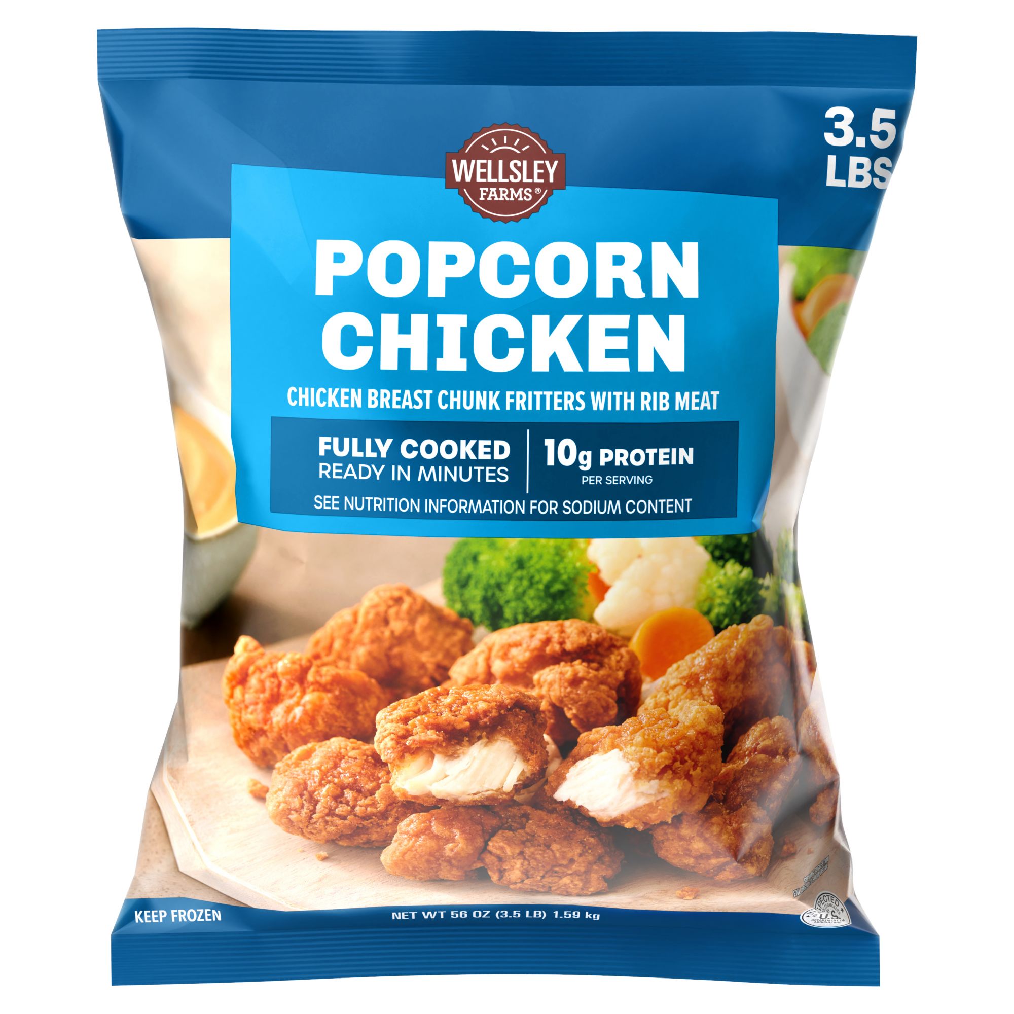 Enjoy crispy, bite-sized goodness with Wellsley Farms Popcorn Chicken. Made from tender white meat chicken, these breaded chicken bites are fully cooked for ultimate convenience. Perfect for a quick meal, party food, or a kid-friendly snack, this family favorite delivers great flavor and a crispy texture in every bite. Crafted with quality ingredients, this 3.5 lb. pack offers good value and is a repeat purchase for those who love restaurant-style taste at home. Serve as an appetizer option, pair with your favorite dipping sauces, or enjoy as a satisfying snack, these bites are easy to prepare and ready in minutes. Make mealtime simple and delicious with Wellsley Farms Popcorn Chicken, your go-to for flavor, convenience, and fun.
