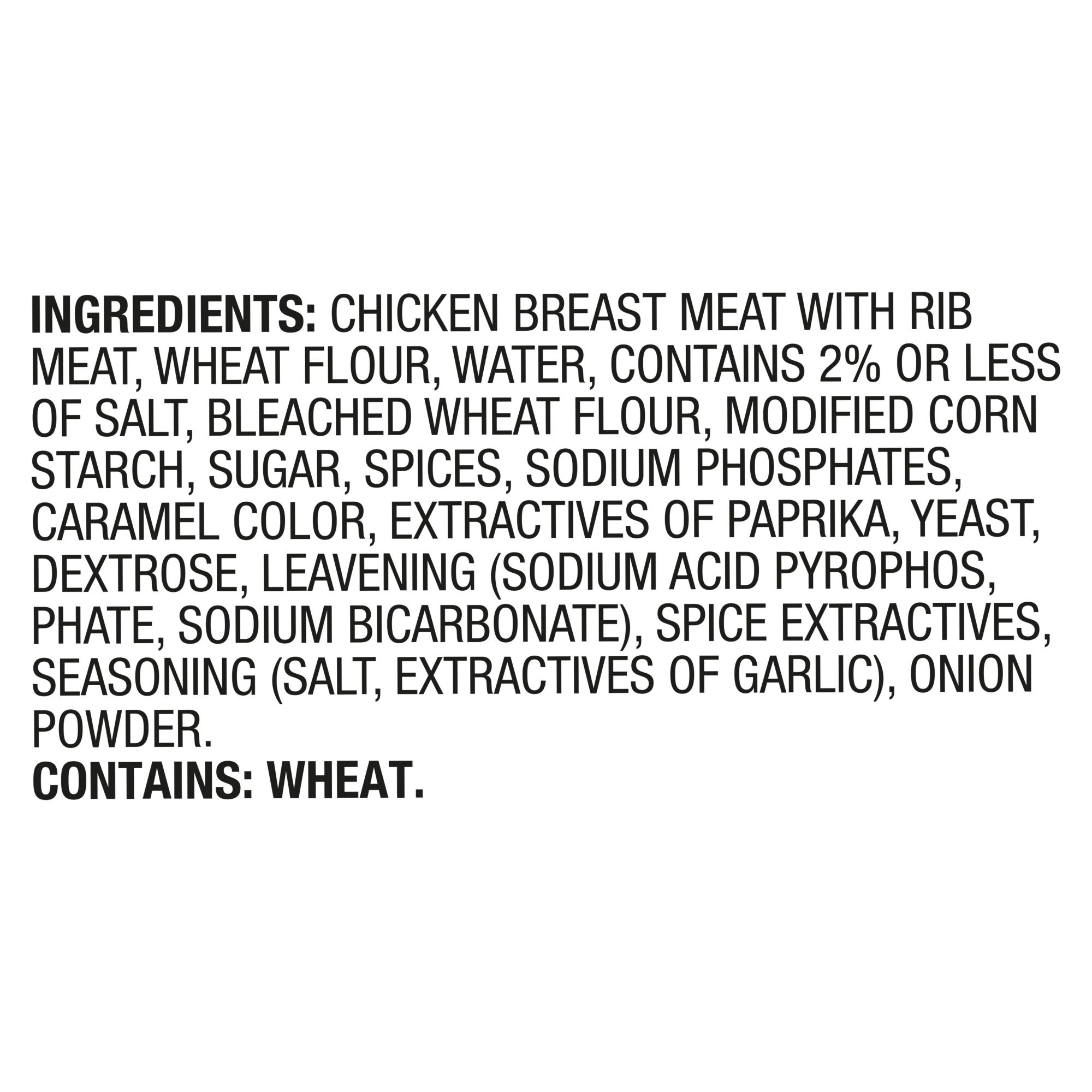 Ingredients: Chicken Breast Meat With Rib Meat, Wheat Flour, Water, Contains 2% Or Less Of Salt, Bleached Wheat Flour, Modified Corn Starch, Sugar, Spices, Sodium Phosphates, Caramel Color, Extractives Of Paprika, Yeast, Dextrose, Leavening (Sodium Acid Pyrophosphate, Sodium Bicarbonate), Spice Extractives, Seasoning (Salt, Extractives Of Garlic), Onion Powder.