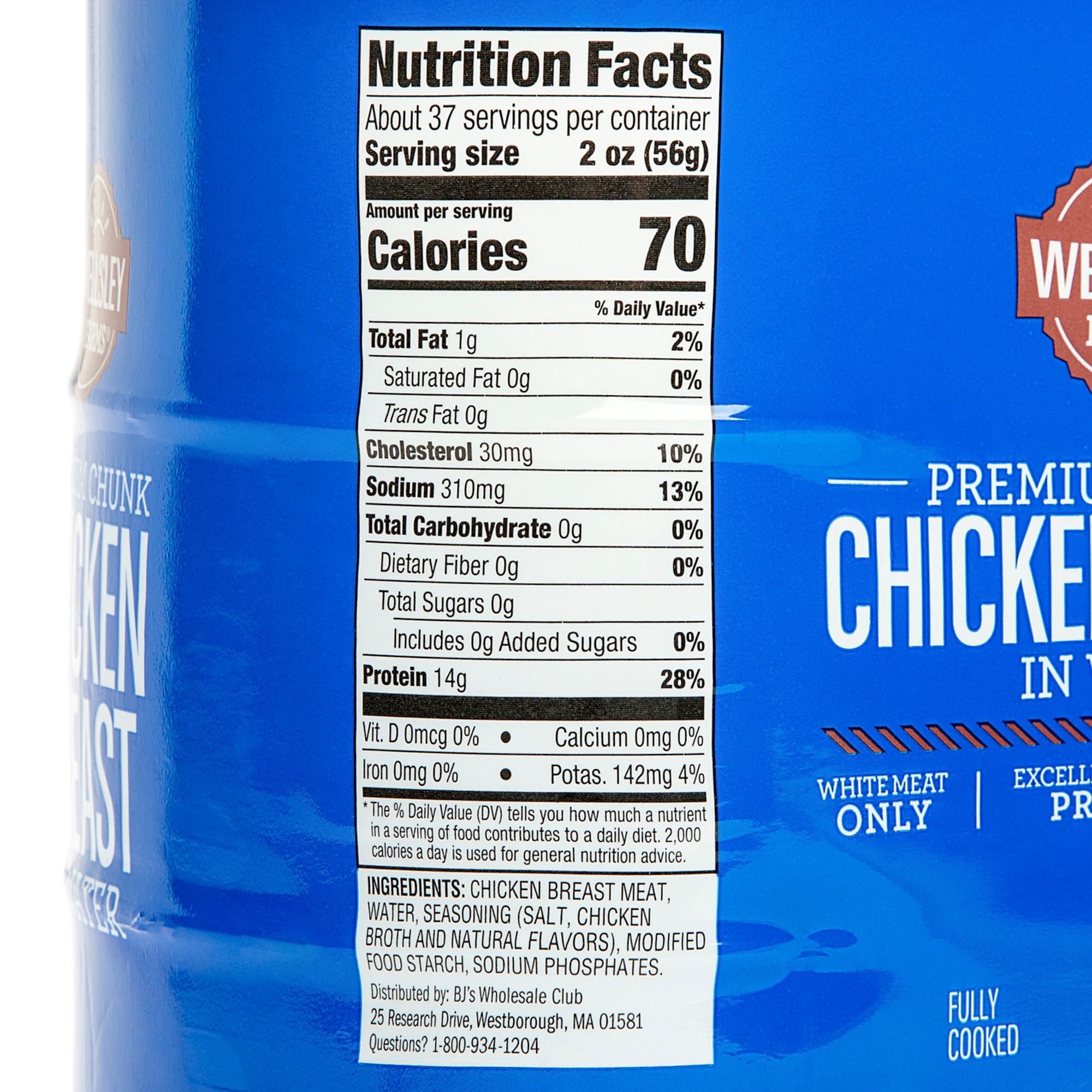 In a 6-count pack, the Wellsley Farms Premium Chunk Chicken Breast in Water is a convenient solution to making meals. Made of white-meat, this fully-cooked chicken is great for salads or sandwich wraps.