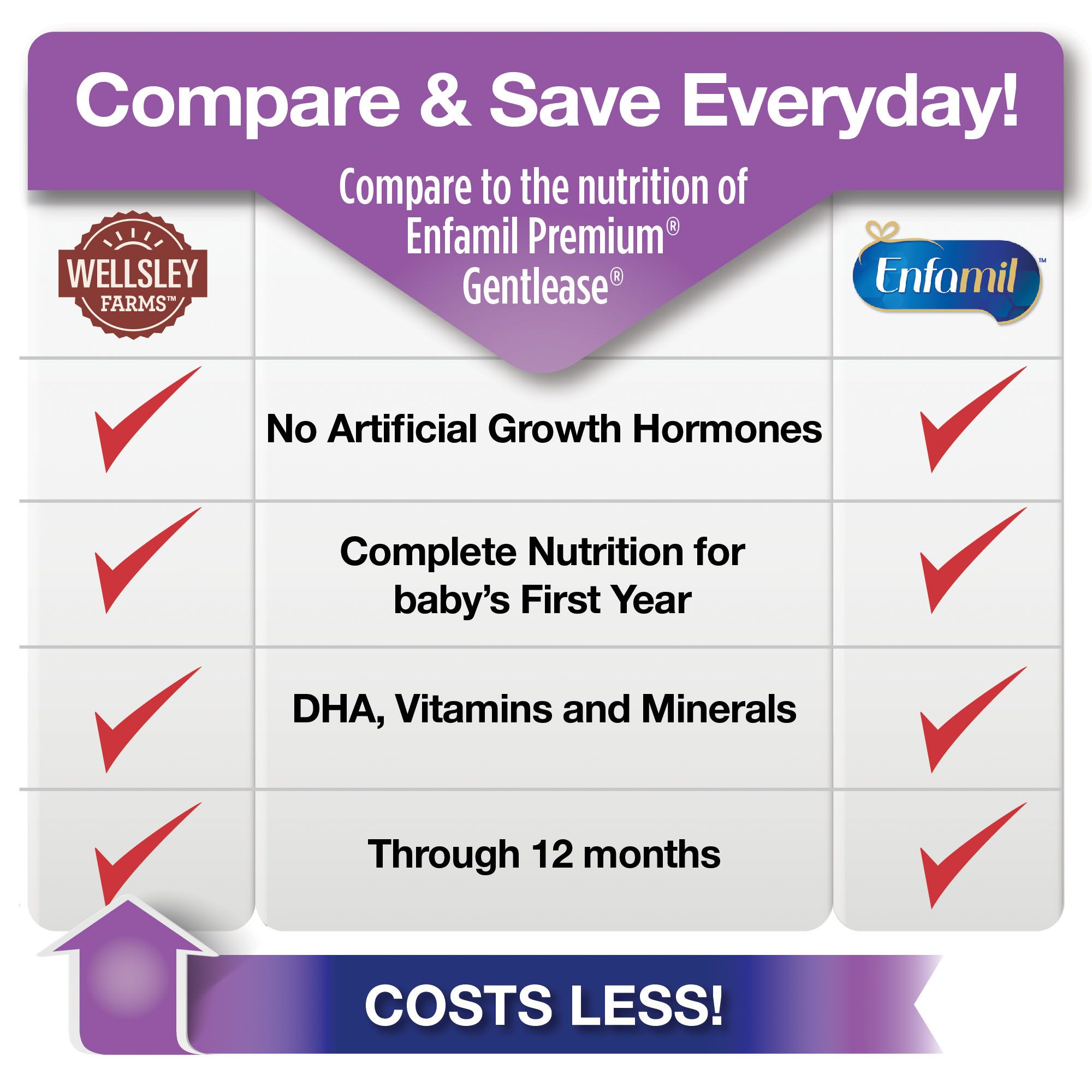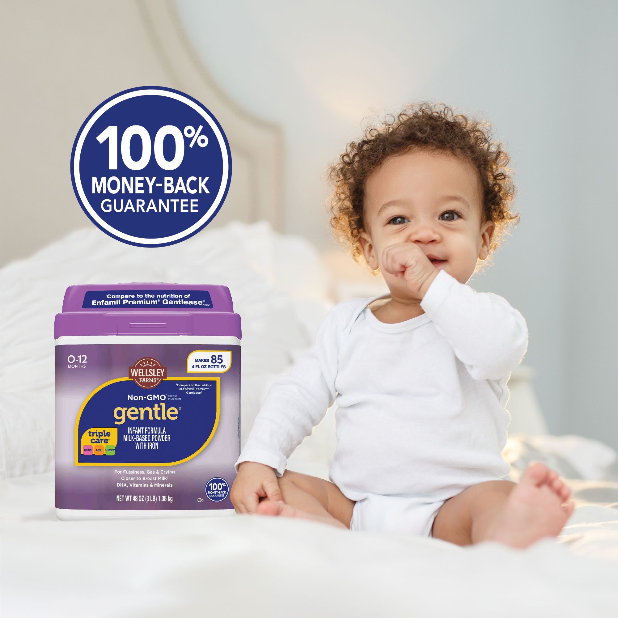 Wellsley Farms Premium Gentle Milk-based Powder with Iron is formed with essential nutrients for a healthy development of your newborn up to 12 months. Its Triple Health Guard formula helps with brain development and strengthens the immune system. Each container includes 48-oz. of infant formula.