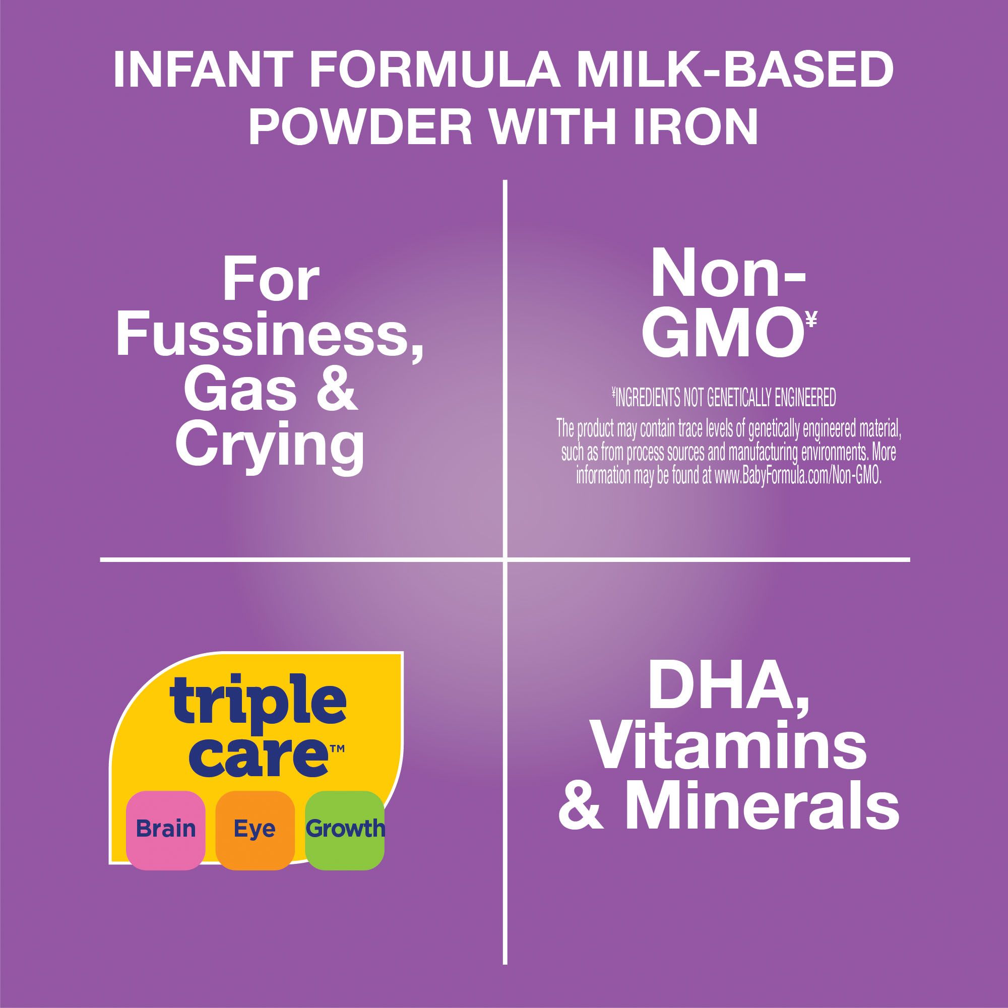 For fussiness, gas and crying Closer to breast milk Triple care: brain, eye and growth Gluten free Non-GMO ingredients DHA, vitamins and minerals Includes 48-oz. infant formula