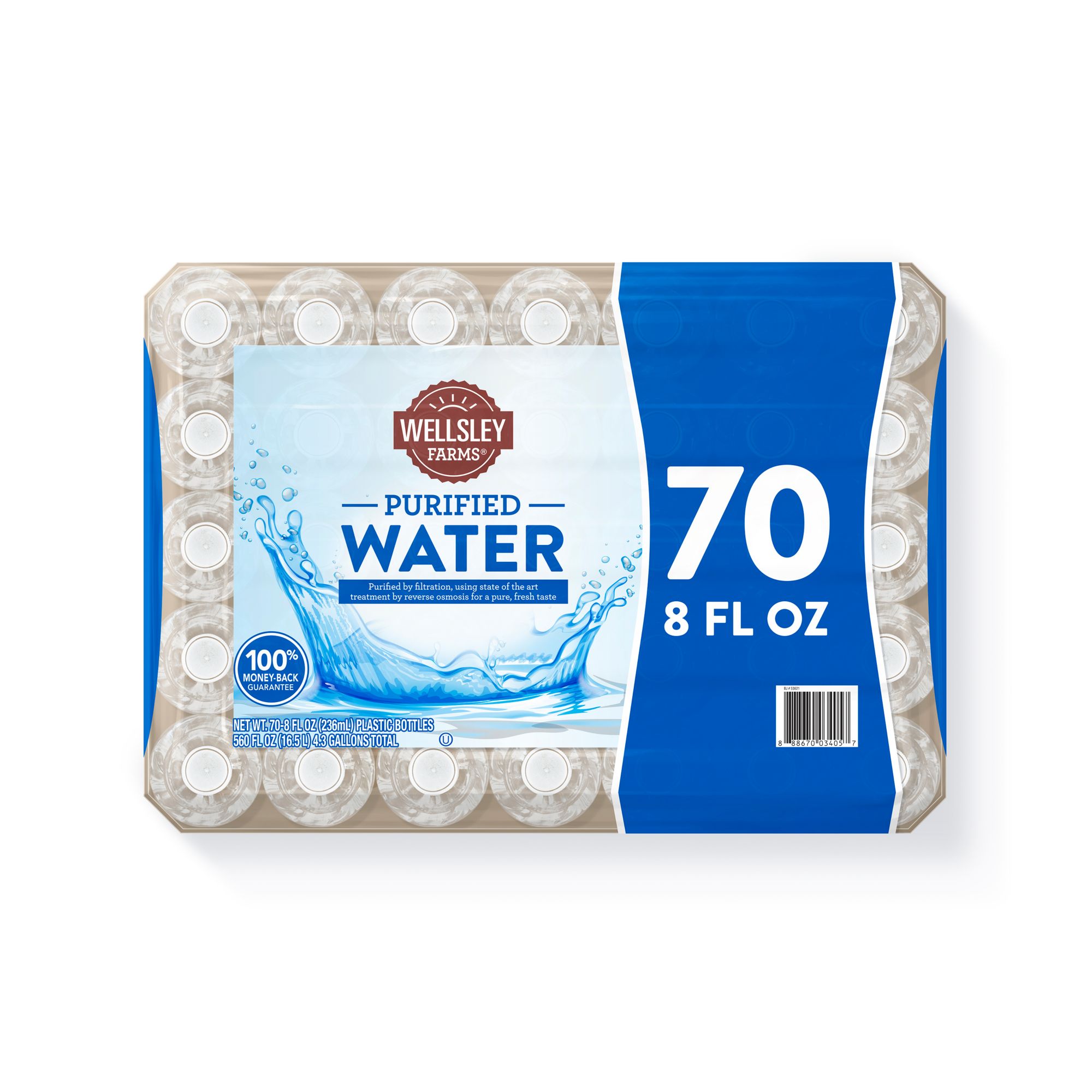 Whether you're hosting an event, replenishing your stock or looking for something to pack in your child's lunches, the Wellsley Farms 8 Oz. Purified Water is sure to come in handy. Wellsley Farms Purified Drinking Water provides high quality, refreshing hydration at great value. With a total of 70 compact bottles, you'll have plenty of refreshing, purified water on hand. Purified water provides a crisp clean taste to stay hydrated.