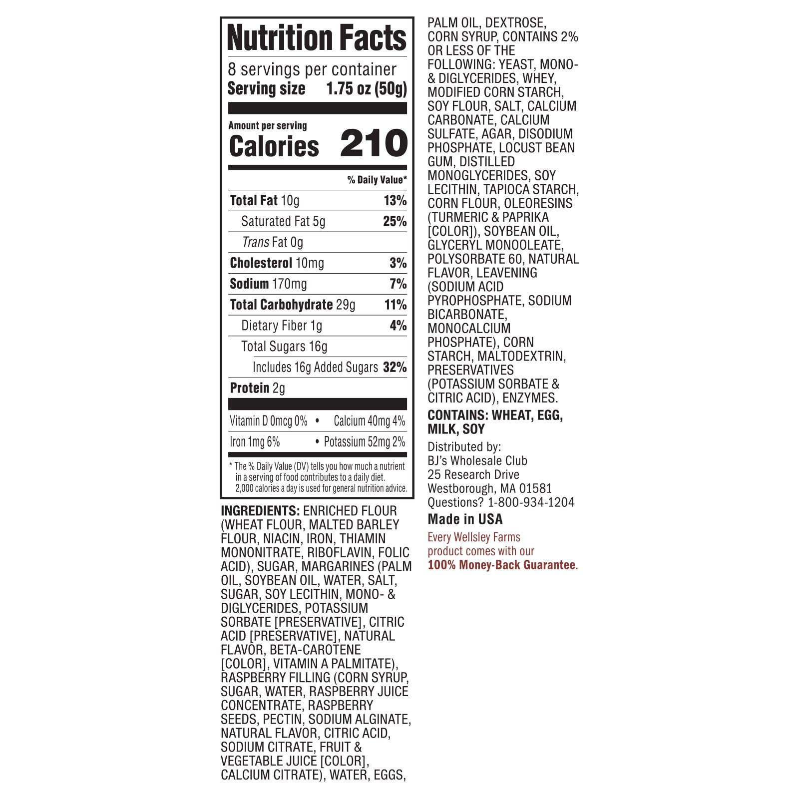 Ingredients: Enriched Flour (Wheat Flour, Malted Barley Flour, Niacin, Iron, Thiamin Mononitrate, Riboflavin, Folic Acid), Sugar, Margarines [Palm Oil, Soybean Oil, Water, Salt, Sugar, Soy Lecithin, Mono- & Diglycerides, Potassium Sorbate (Preservative), Citric Acid (Preservative), Natural Flavor, Beta-Carotene (Color), Vitamin A Palmitate], Raspberry Filling [Corn Syrup, Sugar, Water, Raspberry Juice Concentrate, Raspberry Seeds, Pectin, Sodium Alginate, Natural Flavor, Citric Acid, Sodium Citrate, Fruit & Vegetable Juice (Color), Calcium Citrate], Water, Eggs, Palm Oil, Dextrose, Corn Syrup, Contains 2% or less of the following: Yeast, Mono- & diglycerides, Whey, Modified Corn Starch, Soy Flour, Salt, Calcium Carbonate, Calcium Sulfate, Agar, Disodium Phosphate, Locust Bean Gum, Distilled Monoglycerides, Soy Lecithin, Tapioca Starch, Corn Flour, Oleoresins [Turmeric & Paprika (Color)], Soybean Oil, Glyceryl Monooleate, Polysorbate 60, Natural Flavor, Leavening (Sodium Acid Pyrophosphate, Sodium Bicarbonate, Monocalcium Phosphate), Corn Starch, Maltodextrin, Preservatives (Potassium Sorbate & Citric Acid), Enzymes. Contains: Wheat, Egg, Milk, Soy.