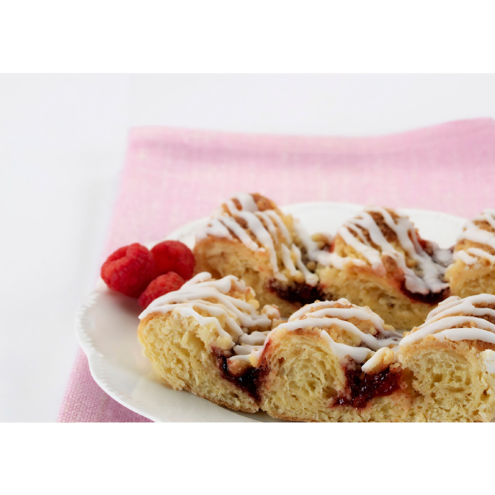 Wellsley Farms Raspberry Danish is a delicious treat for breakfast or dessert! Popping with flavor, the danish pastry dough is ribboned with intense raspberry jam, then topped with sweet drizzle icing. It's raspberry delicious.