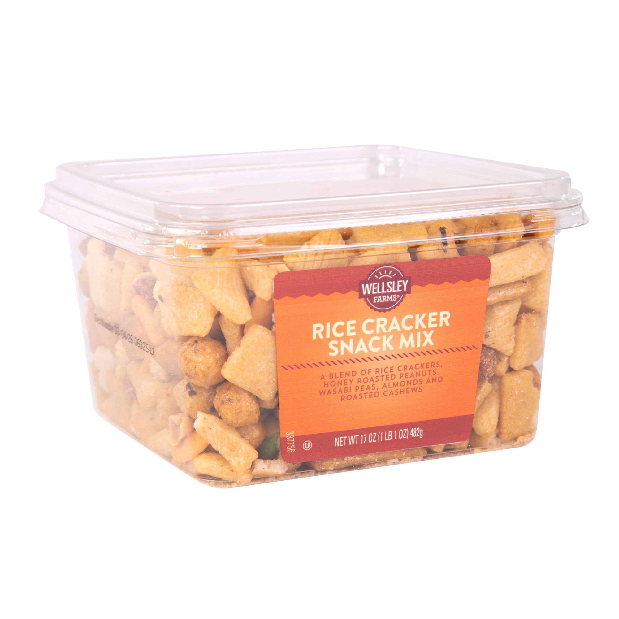 Ingredients: Rice Cracker Mix [Rice, Soy Sauce (Water, Soybeans, Wheat, Salt), Sugar, Glucose, Tapioca Starch, Sesame Seeds, Caramel Color, Paprika Color, Seaweed, Chili], Honey Roasted Peanuts (Peanuts, Sugar, Honey, Peanut Oil, Potato Starch, Maltodextrin, Salt, And Xanthan Gum), Wasabi Green Peas (Peas, Modified Corn Starch, Corn Starch, Sugar, Sea Salt, Soy Bean Oil, Wasabi, Fd&c Yellow #5, Fd&c Blue #1), Almonds, And Roasted Cashews (Cashews, Peanut Oil).