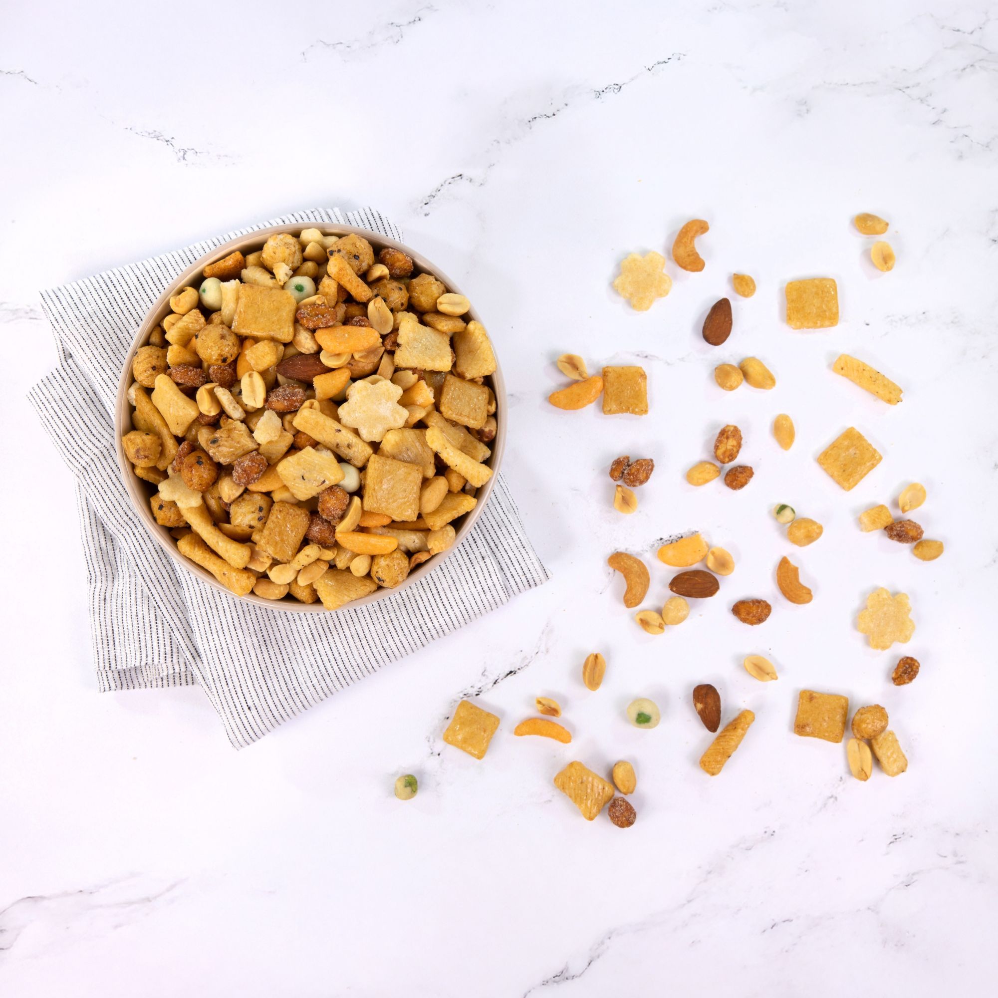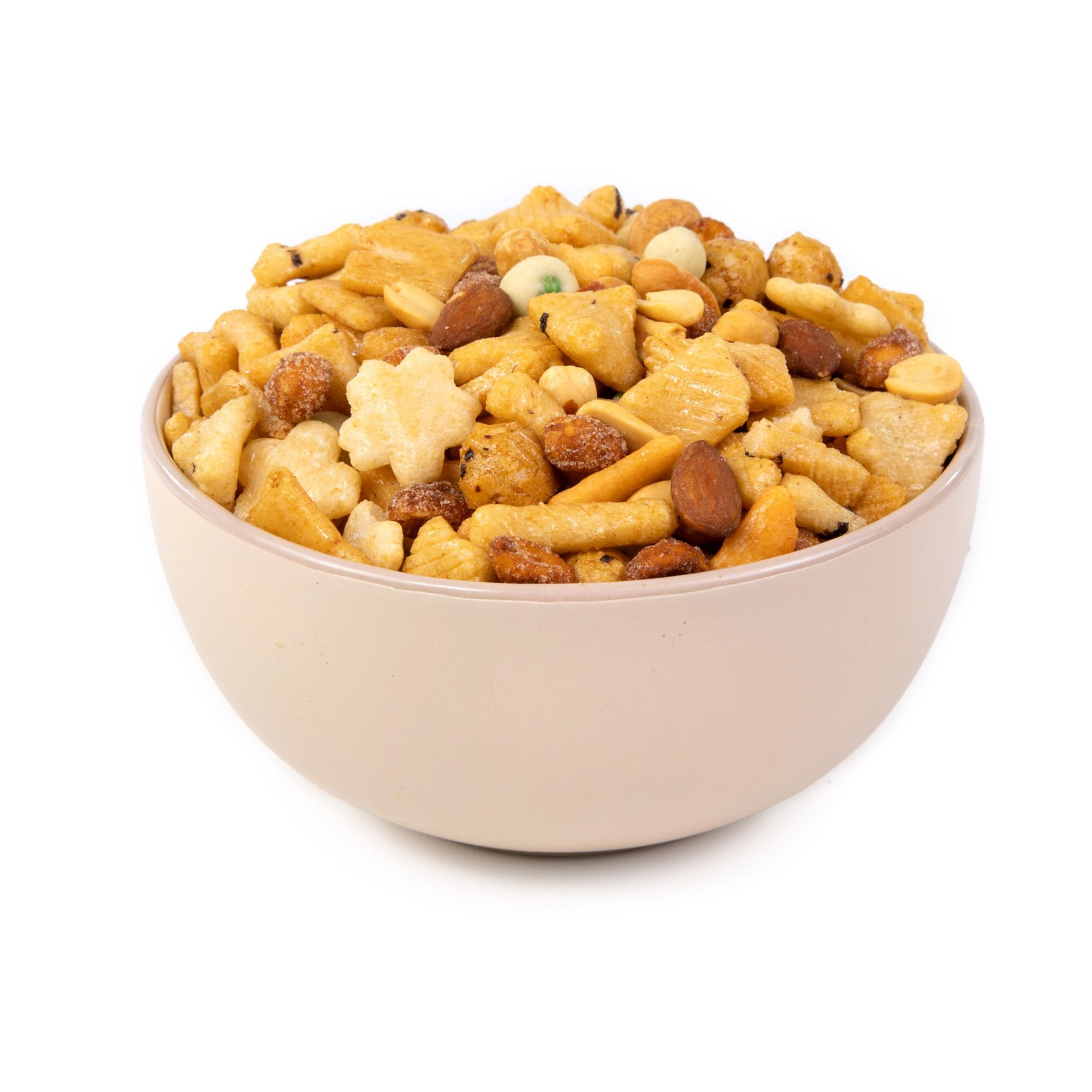 A blend of rice crackers, honey roasted peanuts, wasabi peas, almonds and roasted cashews. Great for an afternoon snack. A combination of salty crackers and crunchy sweet peanuts, almonds, and cashews. This is a great snacking item for the person on the go.