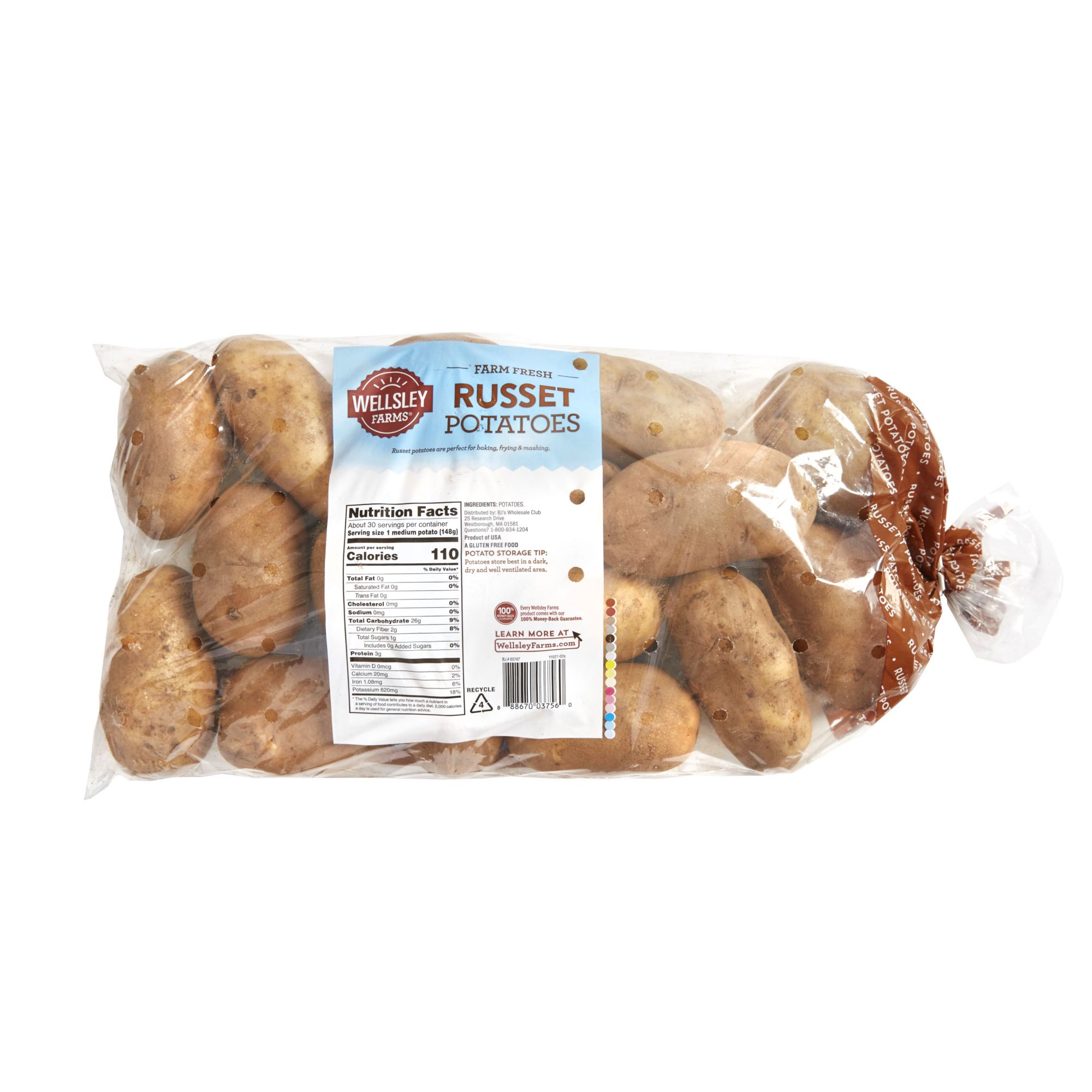 Wellsley Farms Russet Potatoes are delicious and can be used in a variety of recipes. Create mashed potatoes, baked potatoes, scalloped potatoes, and potato salad. This large 10-pound bag provides you with an ample supply to feed the entire family and more.