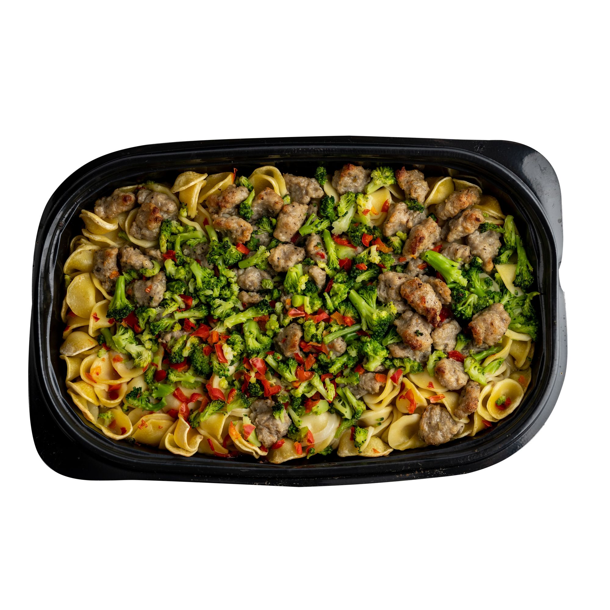 Authentic Italian restaurant quality at home 100 % semolina pasta Quick and easy preparation. Oven ready 20-30 minutes, microwave ready in 8 minutes Made with crumbled Italian sausage, broccoli, red pepper, and garlic Includes 3.2-3.4lbs. of sausage, orecchiette pasta, broccoli, red pepper, sauce