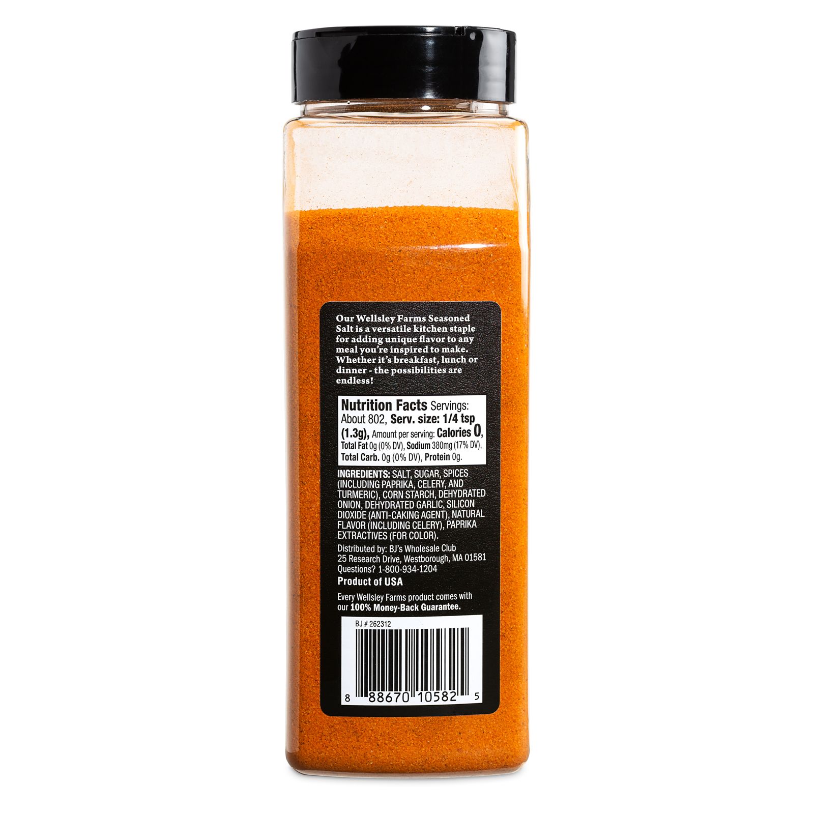 Container is exclusive to BJ's A light-orange, free-flowing, granular blend Serving size: 1/4 tsp Shelf life: 1 year Includes 40 oz. seasoned salt