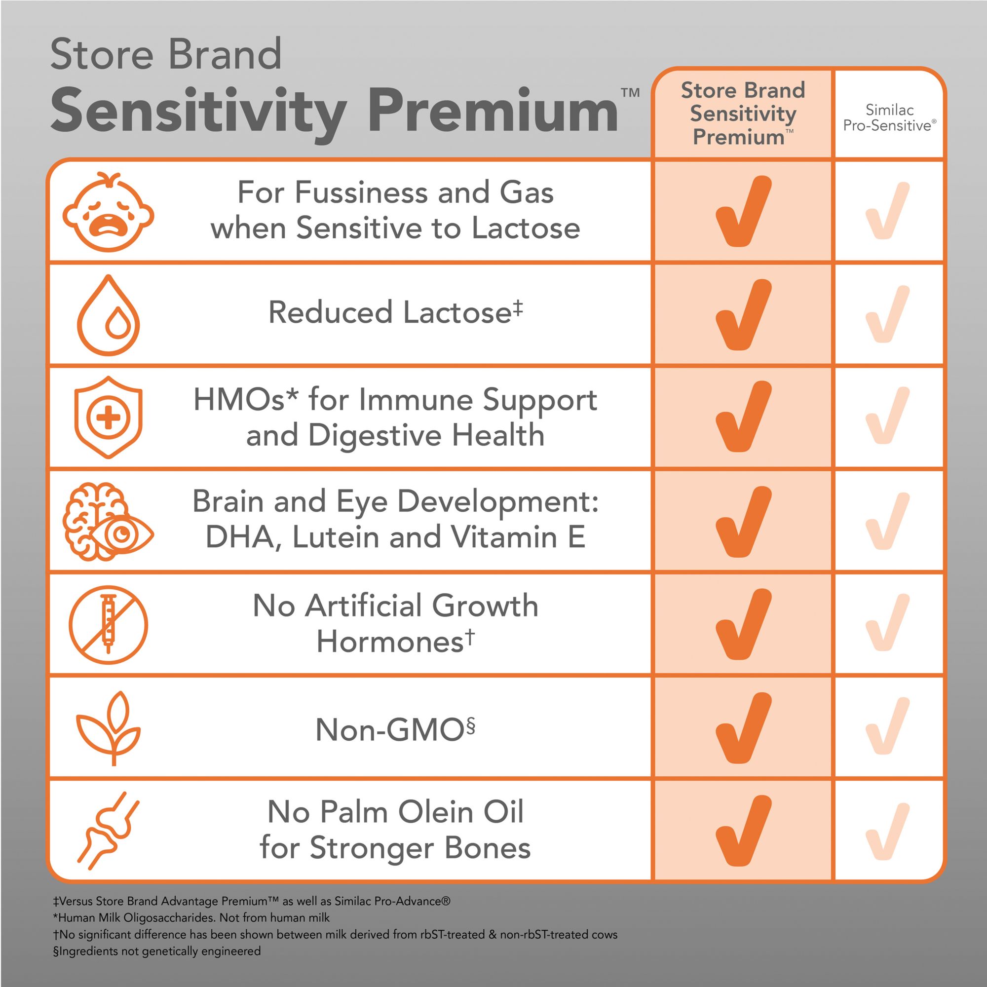COMPLETE NUTRITION: Sensitivity Premium provides complete nutrition for baby's first year. This enhanced formula has multi-HMOs versus single HMO formulation. Compare to the nutrition of Similac Pro-Sensitive. SOOTHES SENSITIVE TUMMIES: With 99 percent less lactose than standard milk-based formula, each serving provides complete nutrition while easing fussiness and gas. Suitable for little ones aged 0-12 months with lactose sensitivity. IMMUNE AND DIGESTIVE SUPPORT: Enhanced with dual HMOs, 2'-FL and LNnT, immune supporting prebiotics commonly found in breast milk. HMOs aid the growth of beneficial bacteria in baby's digestive tract for immune support and digestive health. TRUSTED INGREDIENTS FOR GROWTH: Includes DHA, Lutein, Vitamin E and Choline to help support brain and eye development. Non-GMO, ingredients not genetically engineered. No artificial growth hormones or palm olein oil. SNAP ELIGIBLE: This infant formula can be purchased with Supplemental Nutrition Assistance Program (SNAP) benefits. Like all U.S. infant formulas, Sensitivity Premium Baby Formula meets the same FDA and quality standards as the national brand. Includes Pro-Sensitive Infant Formula