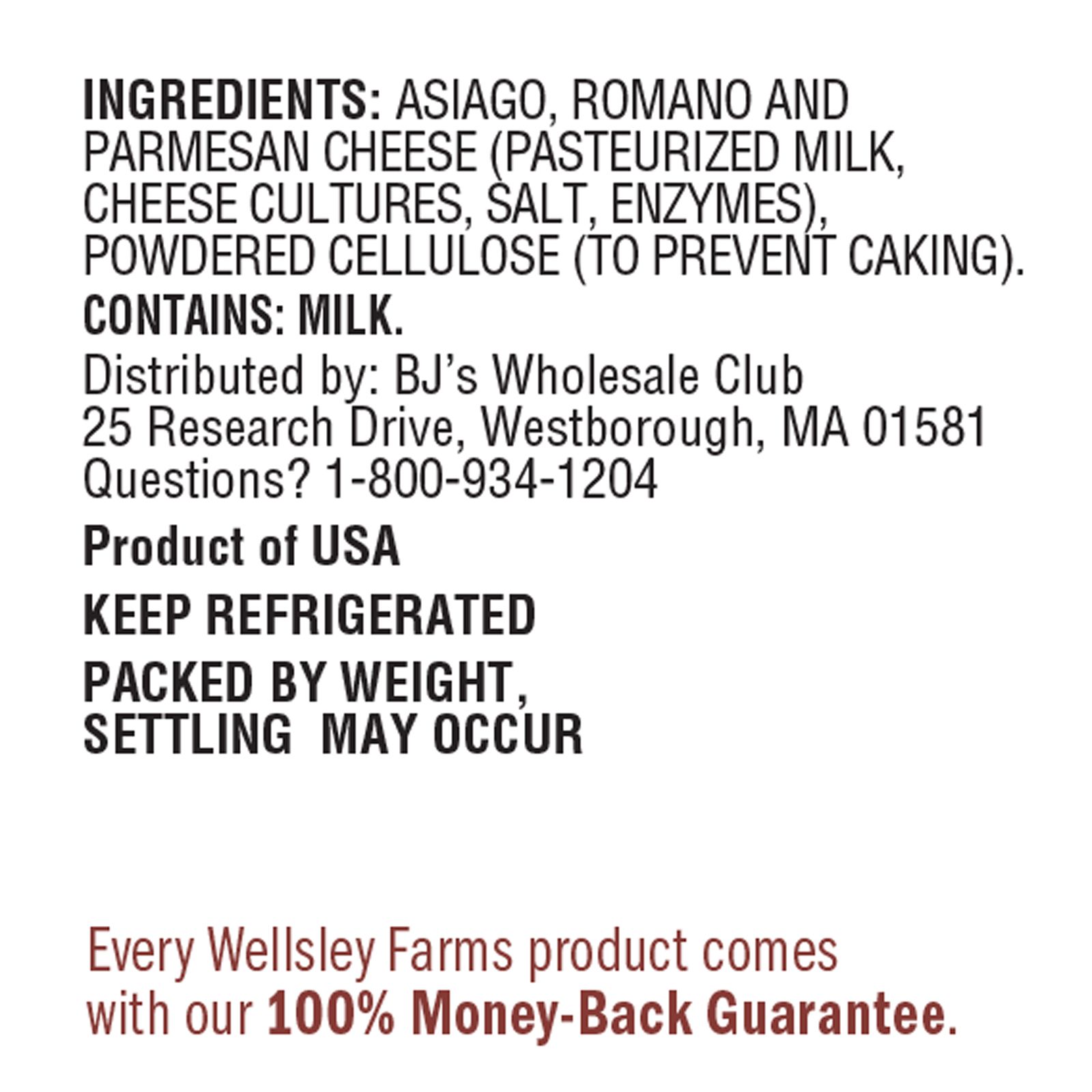 Combining Asiago, Romano and Parmesan cheeses, Wellsley Farms Shredded 3-Cheese Blend is an ideal addition to any of your recipes. This blend of shredded cheese is great on pizza, salad, pasta and more. This trio of classic culinary cheeses can also be used for topping off soup, melting on garlic bread, lasagna filling, or in quiches. These cheeses melt well and stay fresh in the resealable container.