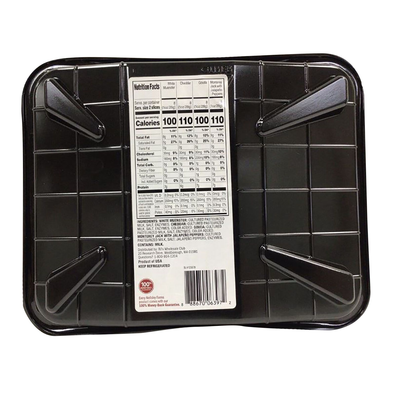 This Wellsley Farms Signature Cheese Sampler is a pre-sliced platter of four different types of cheese for snacking, making burgers or entertaining guests. Indulge your palate with the White Muenster, New York Aged Cheddar, Gouda and Monterey Pepper Jack cheeses.