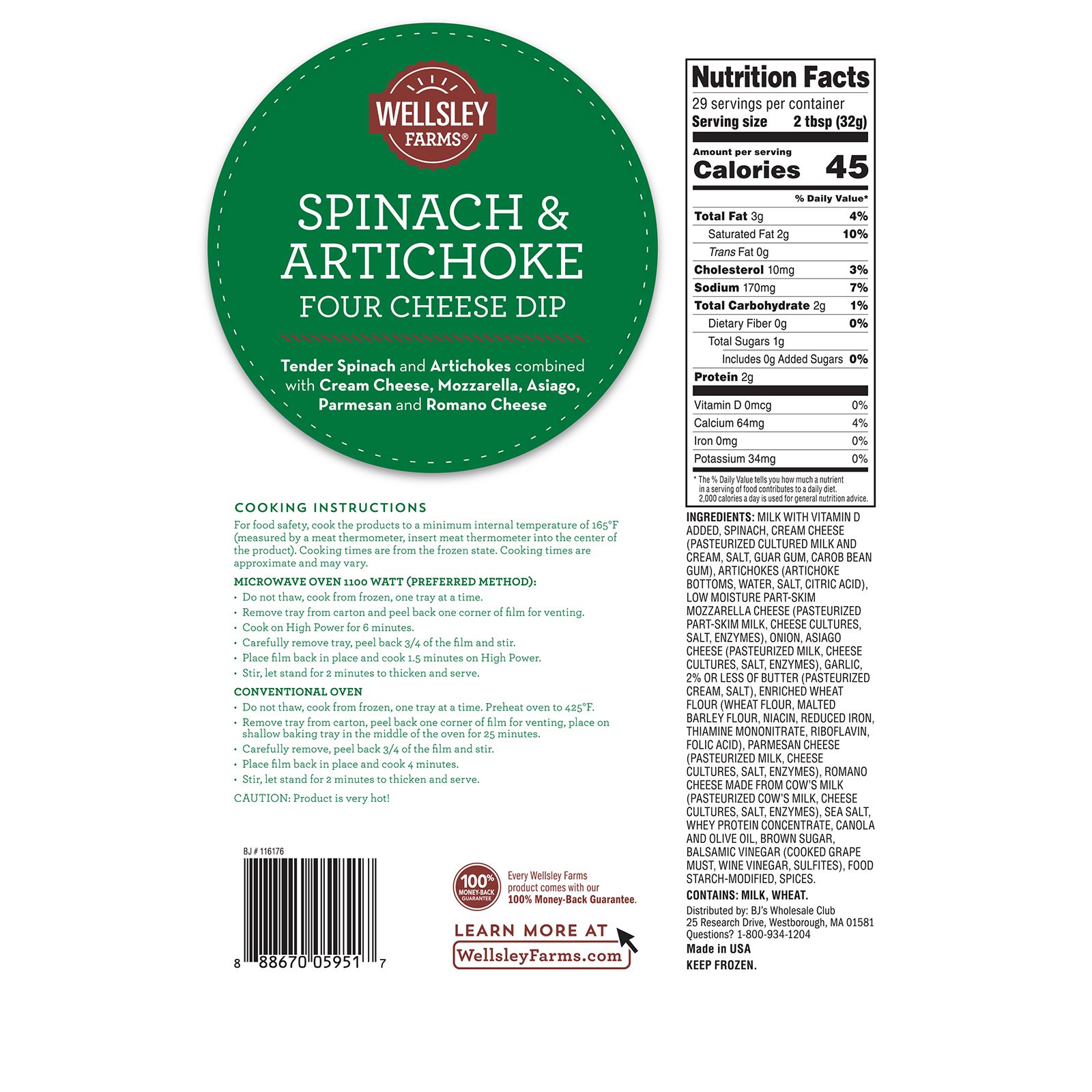 Wellsley Farms Spinach and Artichoke Four Cheese Dip includes tender spinach and artichoke hearts combined with mozzarella, Asiago, Parmesan and Romano cheese to create a delectable dipping experience.