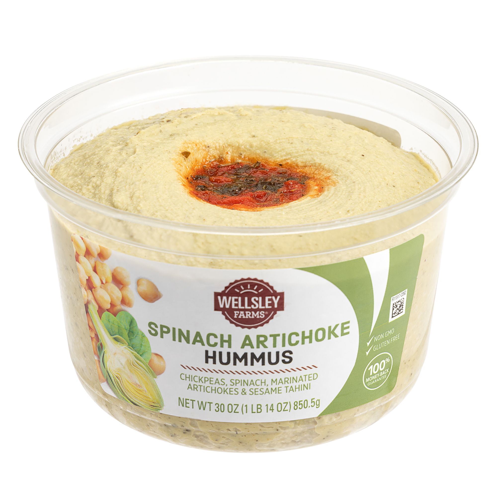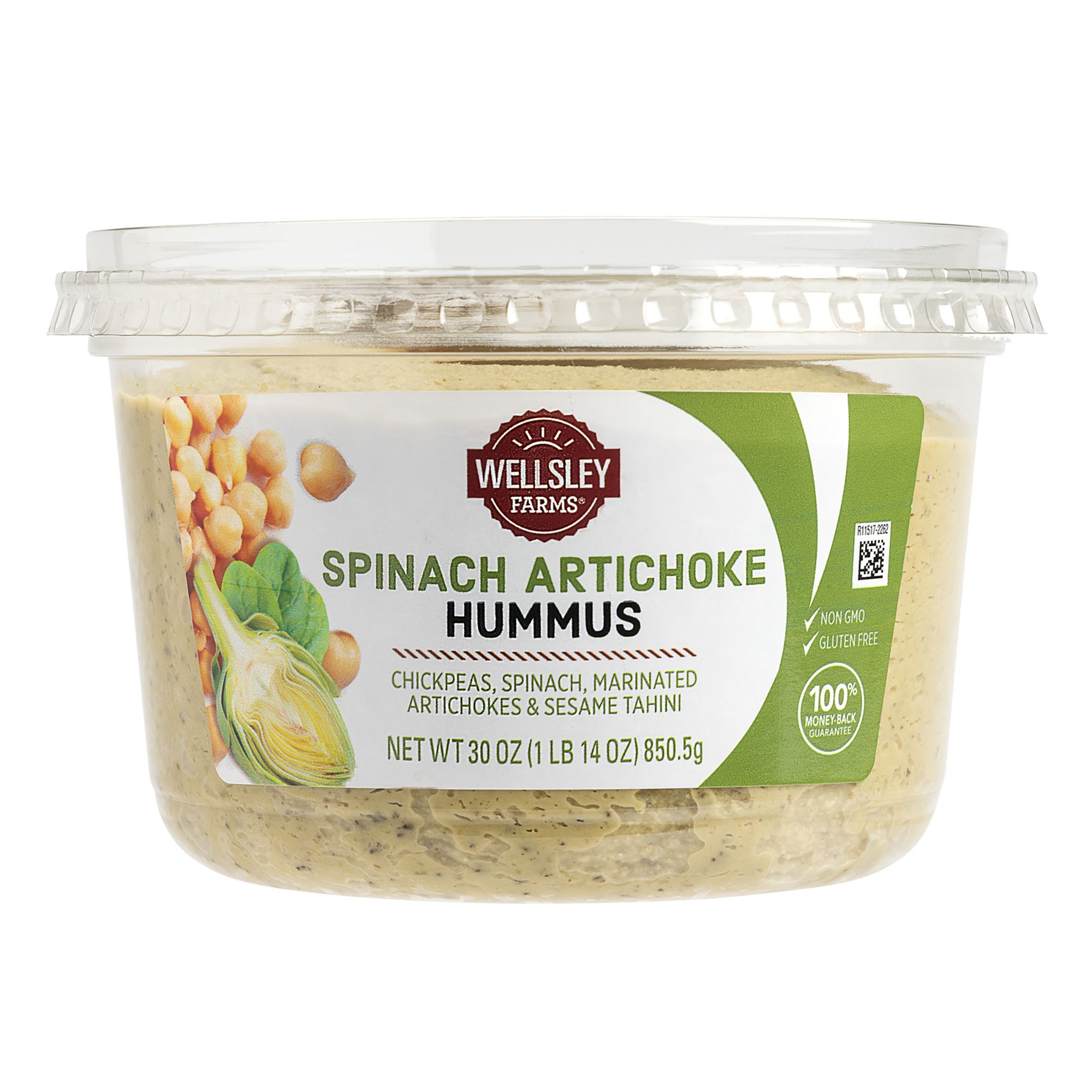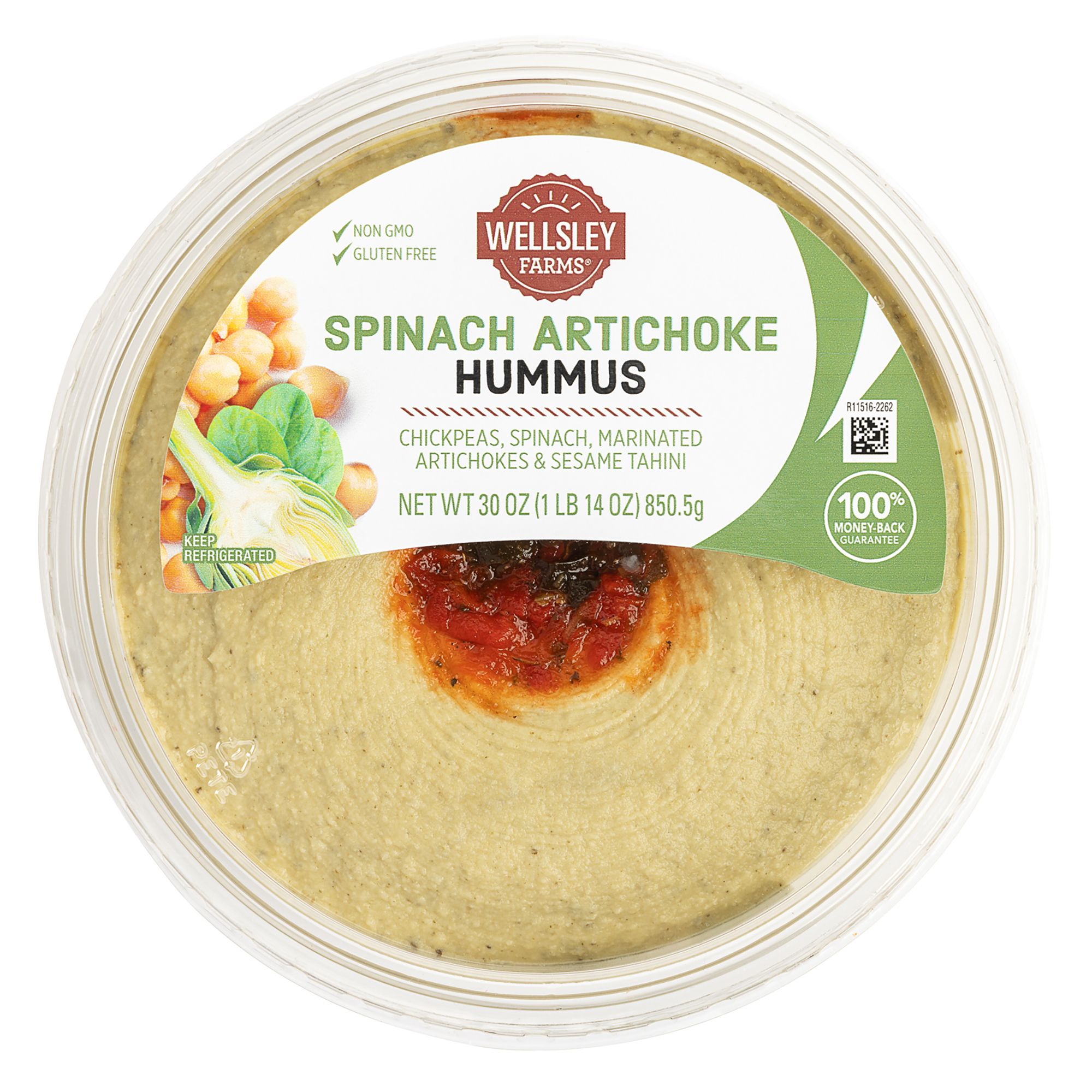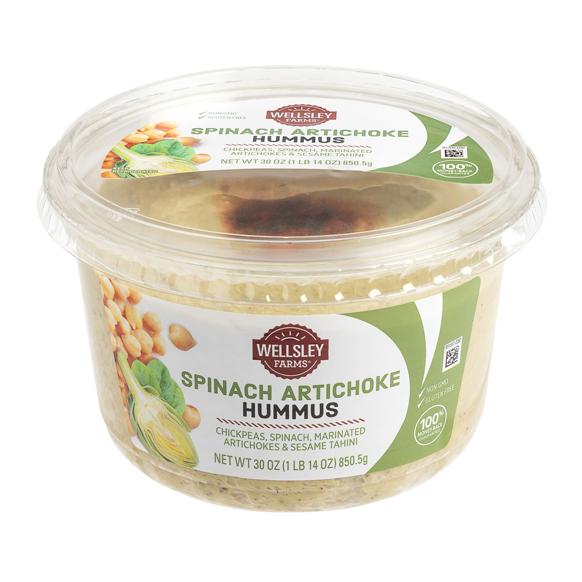 Wellsley Farms Spinach and Artichoke Hummus is great to pair with pita chips or vegetables. It is made with a hint of garlic, sea salt and basil, offering a extra burst of flavor. This veggie-based snack is great for sharing at home or as a party dip appetizer.