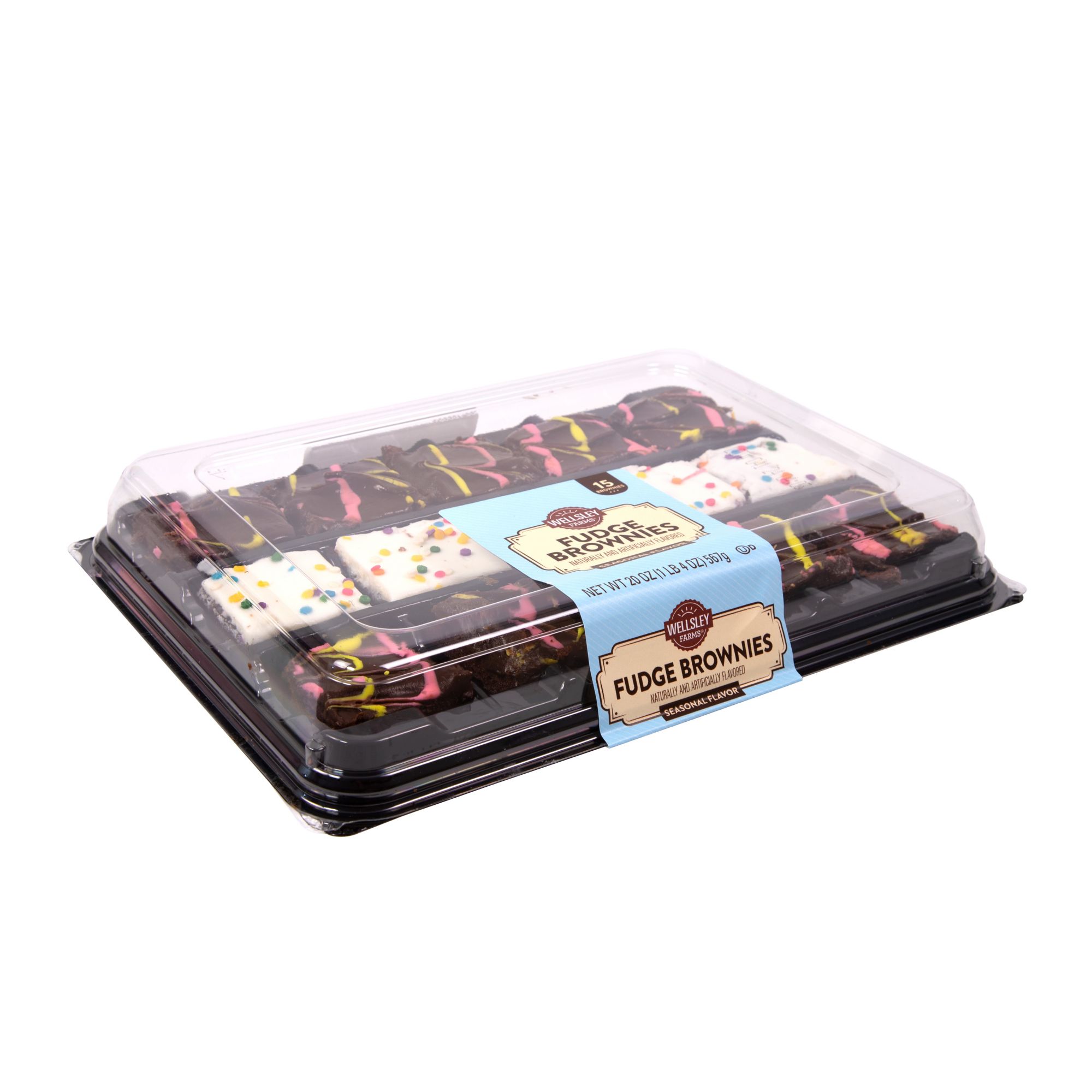 Wellsley Farms Spring Brownie Tray is a platter of 15 brownies with ten fudge iced brownies with pink and yellow drizzle, and five white iced brownies with quins. The product comes in a resealable plastic stay fresh container. These brownies are a great spring dessert item for a party, school gathering or an everyday at home any occasion.