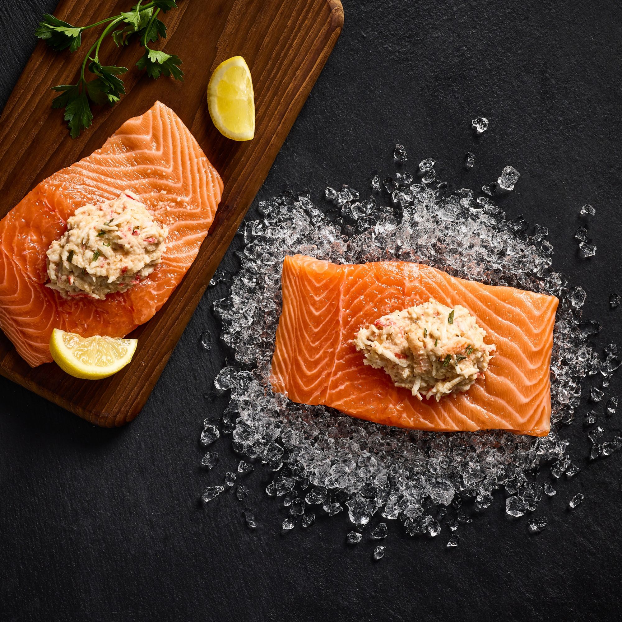 This Farm Salmon Seafood stuffed portions is ready to cook. Each portion is more than enough for one person. The delicious rich seafood stuffing contains shrimp, fish and crab.
