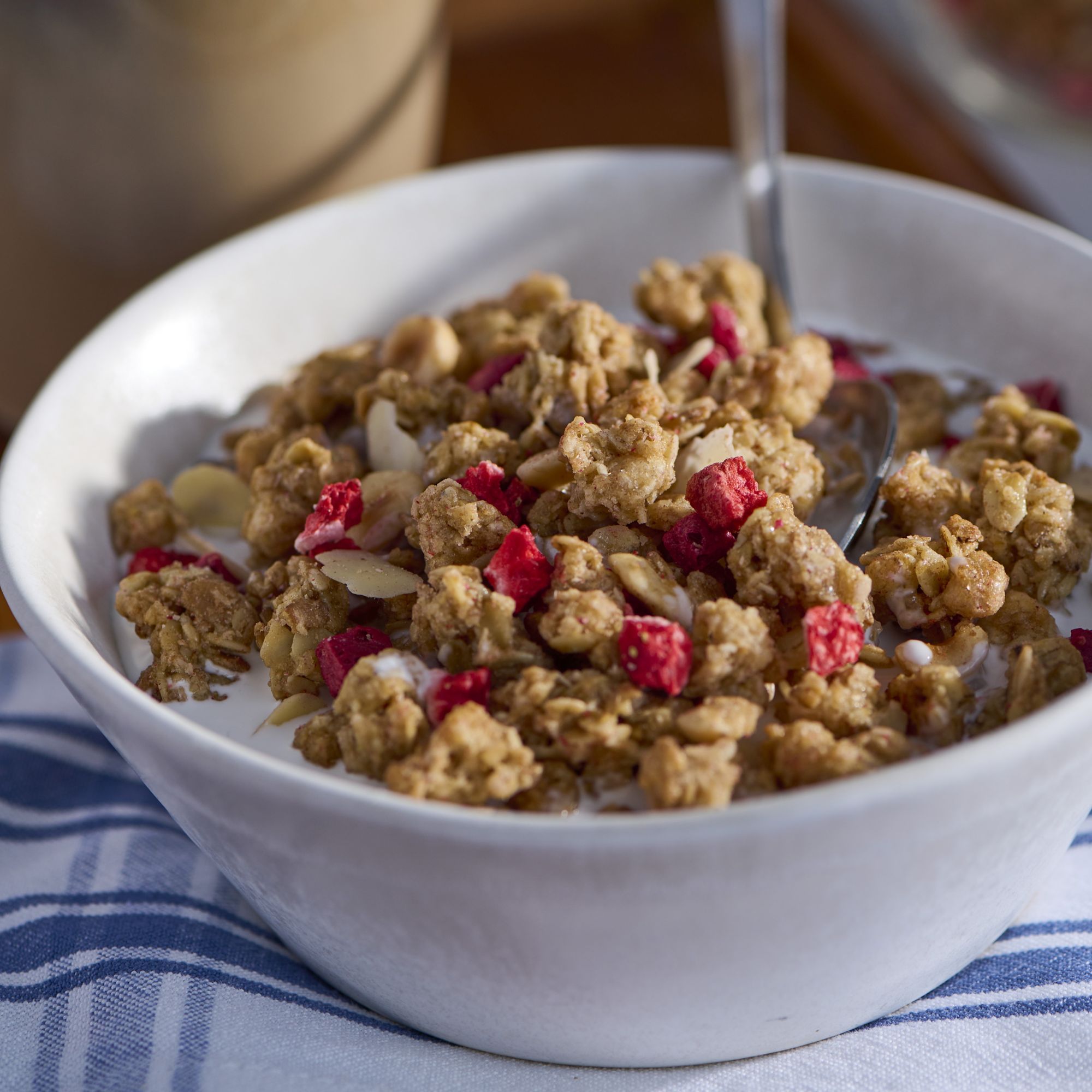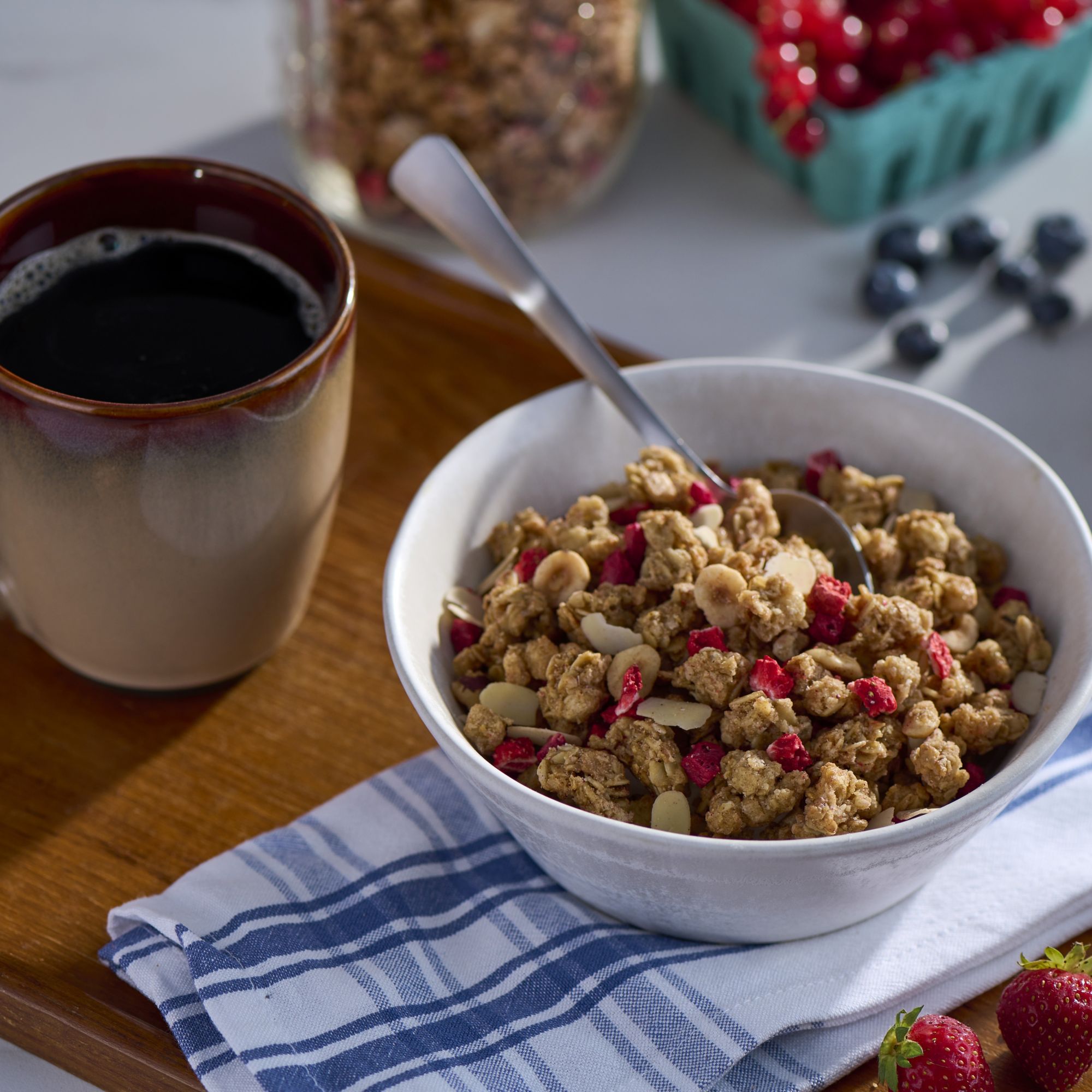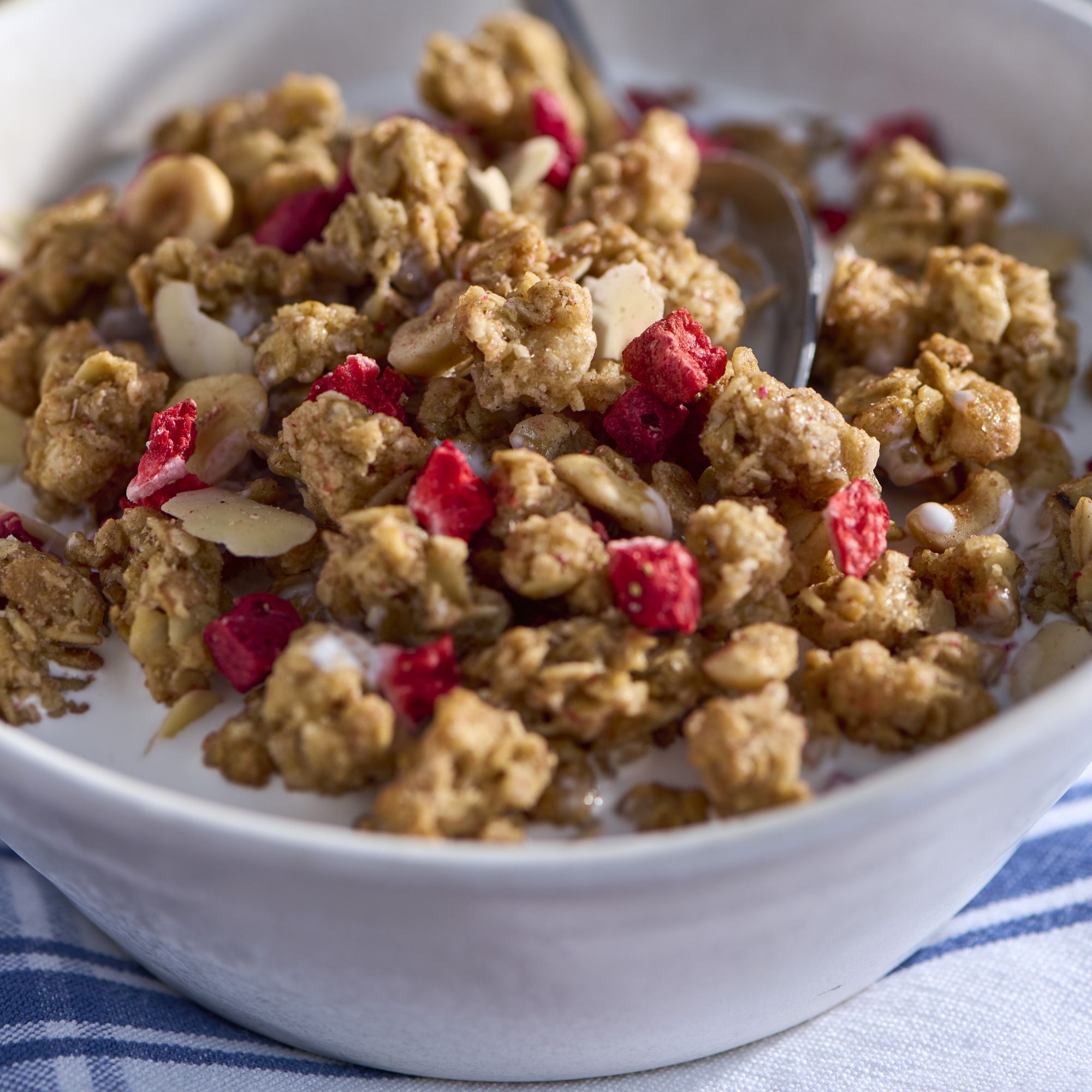 Made with crunchy oats, grains, almonds and hazelnuts Topped with real strawberries and raspberry bits Inspired by the traditional muesli recipe Includes 2 lbs. of granola