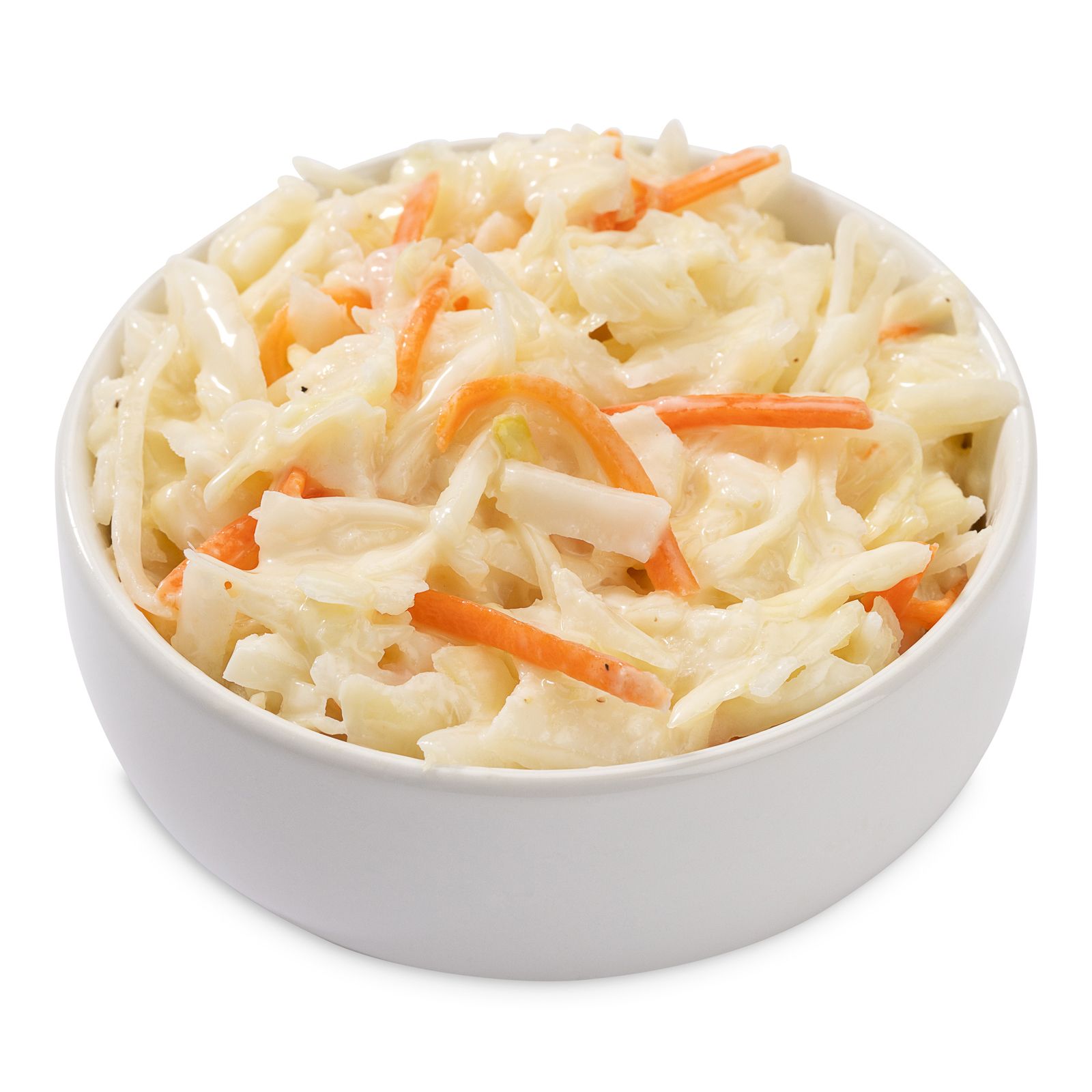 Traditional cole slaw made with cabbage, mayonnaise, carrots, and spices