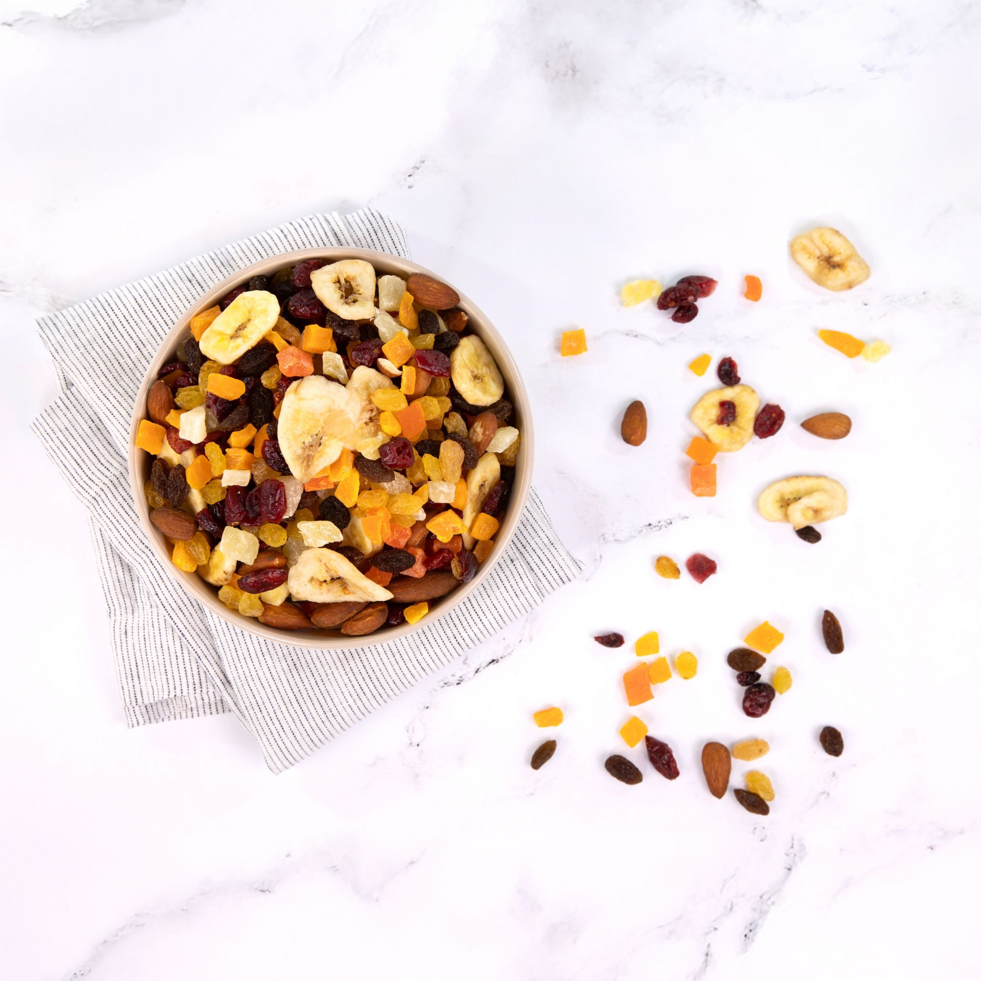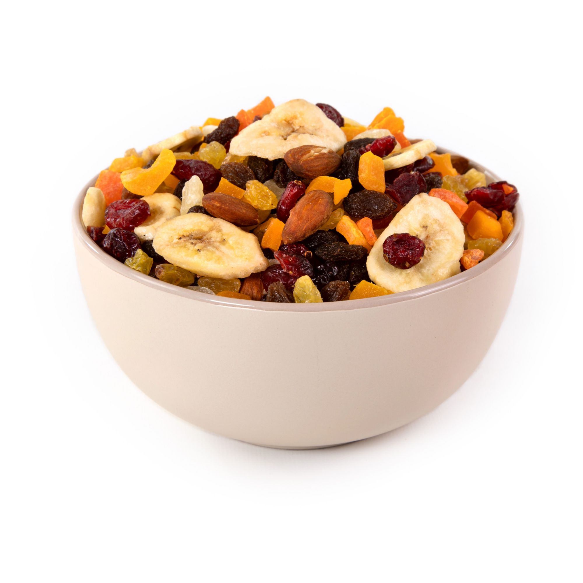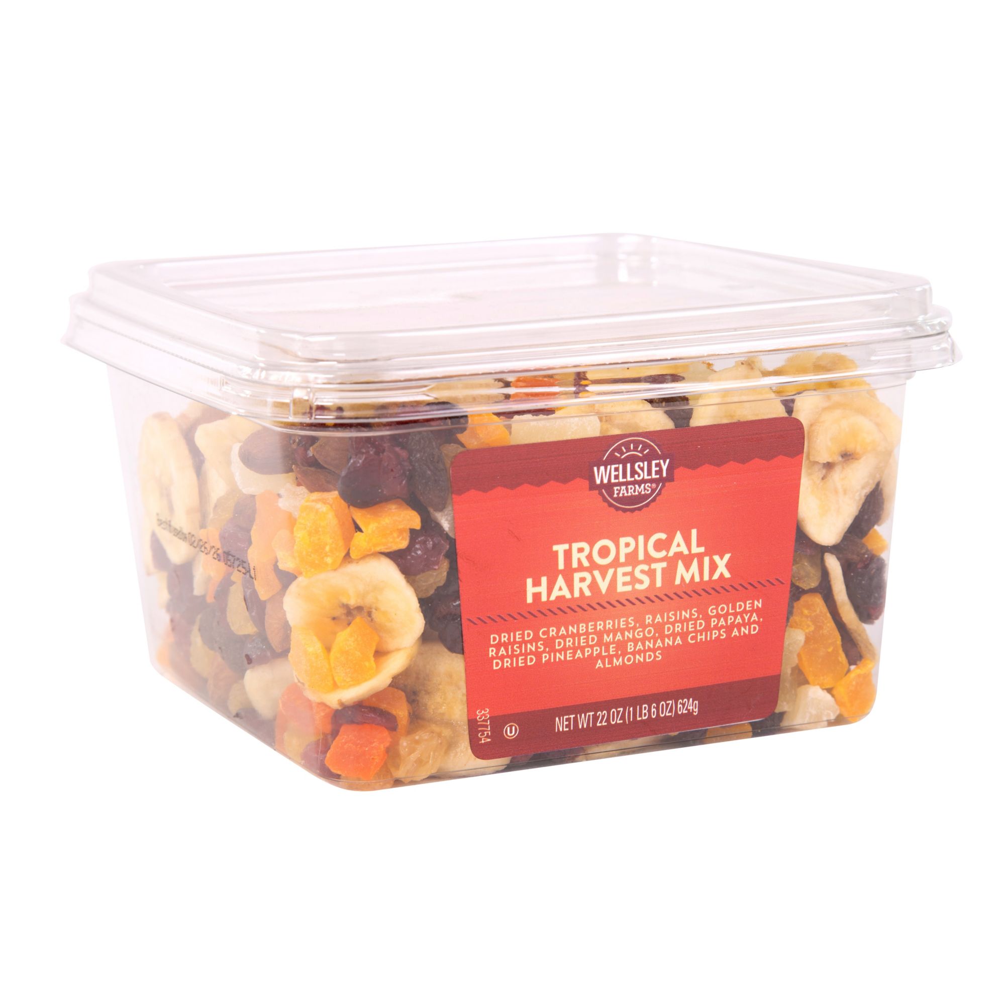 Includes dried cranberries, raisins, golden raisins, dried mango, dried papaya, dried pineapple, banana chips and almonds, 22 oz.