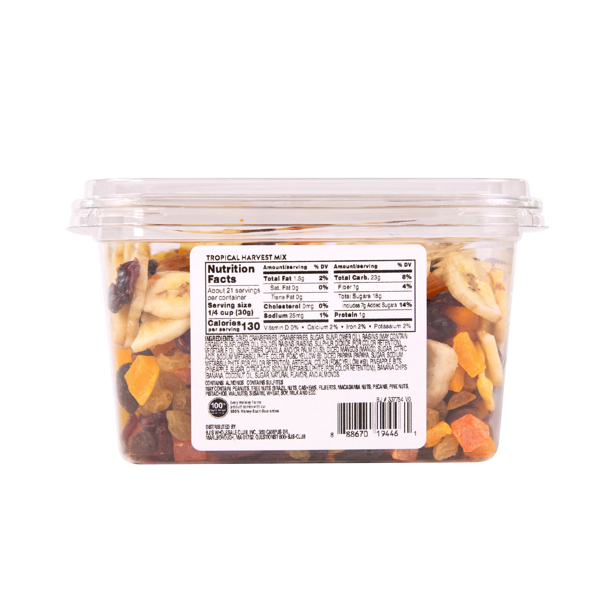 Ingredients: Dried Cranberries (Cranberries, Sugar, Sunflower Oil), Raisins (May Contain Organic Sunflower Oil), Golden Raisins (Raisins, Sulphur Dioxide (For Color Retention), Vegetable Oil (Sunflower, Canola, And/or Palm Oils)), Diced Mangos (Mango, Sugar, Citric Acid, Sodium Metabisulphite, Color (Fd&c Yellow 6)), Diced Papaya (Papaya, Sugar, Sodium Metabisulphite (For Color Retention), Artificial Color (Fd&c Yellow #6)), Pineapple Bits (Pineapple, Sugar, Citric Acid, Sodium Metabisulphite (For Color Retention)), Banana Chips (Banana, Coconut Oil, Sugar, Natural Flavor), And Almonds.