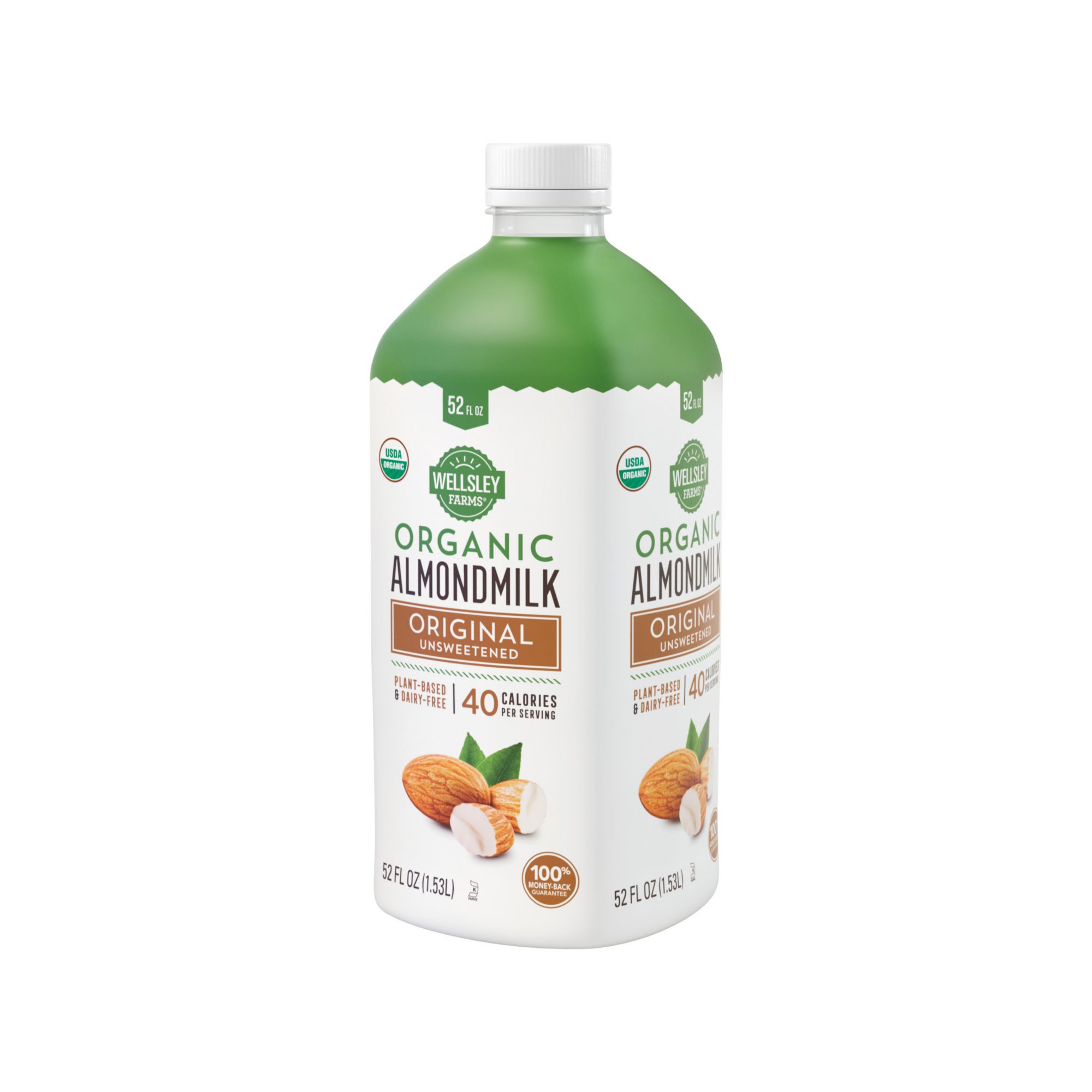 Wellsley Farms USDA Organic Unsweetened Original Almondmilk is organic, kosher and gluten free. It's made from real organic almonds with only 40 calories and 0g of sugars per serving. Pour almond milk over your favorite bowl of cereal, add it for your morning smoothie or protein shake, grab a glass to enjoy with your favorite nut butter and jam sandwich, and you can even use almond milk as creamer for your coffee.